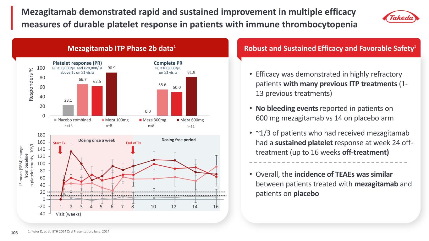 Mezagitamab demonstrated rapid and sustained improvement in multiple efficacy measures of durable platelet response in patients with immune thrombocytopenia 23.1 0.0 66.7 55.6 62.5 50.0 90.9 81.8 0 20 40 60 80 100 Re sp on de rs % Placebo combined Meza 100mg Meza 300mg Meza 600mg Visit (weeks) Platelet response (PR) PC ≥50,000/µL and ≥20,000/µL above BL on ≥2 visits Complete PR PC ≥100,000/µL on ≥2 visits • Efficacy was demonstrated in highly refractory patients with many previous ITP treatments (1- 13 previous treatments) • No bleeding events reported in patients on 600 mg mezagitamab vs 14 on placebo arm • ~1/3 of patients who had received mezagitamab had a sustained platelet response at week 24 off- treatment (up to 16 weeks off-treatment) • Overall, the incidence of TEAEs was similar between patients treated with mezagitamab and patients on placebo n=13 n=9 1 2 3 4 5 6 7 8 10 12 14 16 Mezagitamab ITP Phase 2b data1 Robust and Sustained Efficacy and Favorable Safety1 Start Tx End of Tx Dosing free periodDosing once a week 1. Kuter D, et al. ISTH 2024 Oral Presentation, June, 2024 -40 -20 0 20 40 60 80 100 120 140 160 180 LS m ea n (S EM ) c ha ng e fr om b as el in e in p la te le t c ou nt s, 1 09 / L n=8 n=11 106