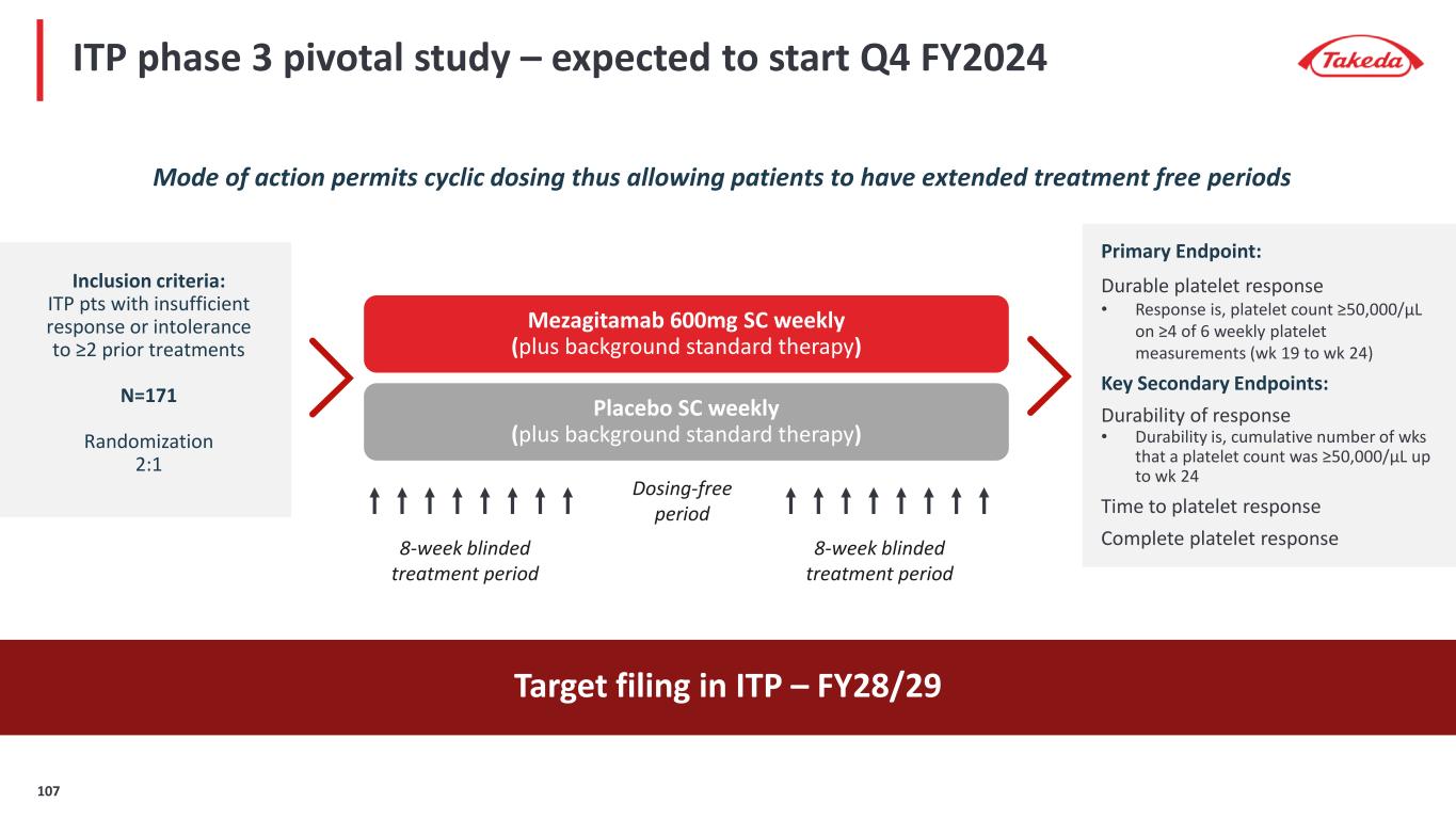 ITP phase 3 pivotal study – expected to start Q4 FY2024 8-week blinded treatment period Mezagitamab 600mg SC weekly (plus background standard therapy) Placebo SC weekly (plus background standard therapy) Dosing-free period 8-week blinded treatment period Target filing in ITP – FY28/29 Mode of action permits cyclic dosing thus allowing patients to have extended treatment free periods Primary Endpoint: Durable platelet response • Response is, platelet count ≥50,000/μL on ≥4 of 6 weekly platelet measurements (wk 19 to wk 24) Key Secondary Endpoints: Durability of response • Durability is, cumulative number of wks that a platelet count was ≥50,000/μL up to wk 24 Time to platelet response Complete platelet response Inclusion criteria: ITP pts with insufficient response or intolerance to ≥2 prior treatments N=171 Randomization 2:1 107