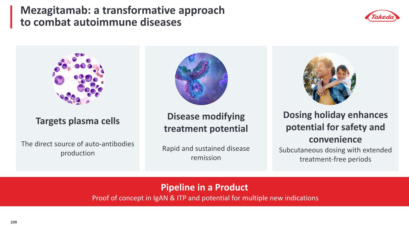 Dosing holiday enhances potential for safety and convenience Subcutaneous dosing with extended treatment-free periods Mezagitamab: a transformative approach to combat autoimmune diseases Targets plasma cells The direct source of auto-antibodies production Disease modifying treatment potential Rapid and sustained disease remission Pipeline in a Product Proof of concept in IgAN & ITP and potential for multiple new indications 109