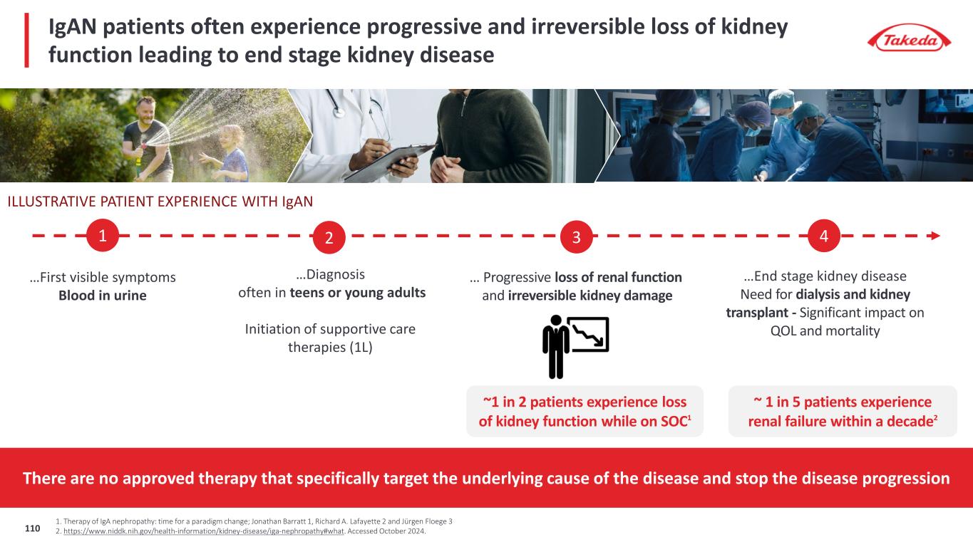 IgAN patients often experience progressive and irreversible loss of kidney function leading to end stage kidney disease 1 2 3 4 …First visible symptoms Blood in urine … Progressive loss of renal function and irreversible kidney damage …End stage kidney disease Need for dialysis and kidney transplant - Significant impact on QOL and mortality There are no approved therapy that specifically target the underlying cause of the disease and stop the disease progression …Diagnosis often in teens or young adults Initiation of supportive care therapies (1L) ILLUSTRATIVE PATIENT EXPERIENCE WITH IgAN ~1 in 2 patients experience loss of kidney function while on SOC1 ~ 1 in 5 patients experience renal failure within a decade2 1. Therapy of IgA nephropathy: time for a paradigm change; Jonathan Barratt 1, Richard A. Lafayette 2 and Jürgen Floege 3 2. https://www.niddk.nih.gov/health-information/kidney-disease/iga-nephropathy#what. Accessed October 2024.110