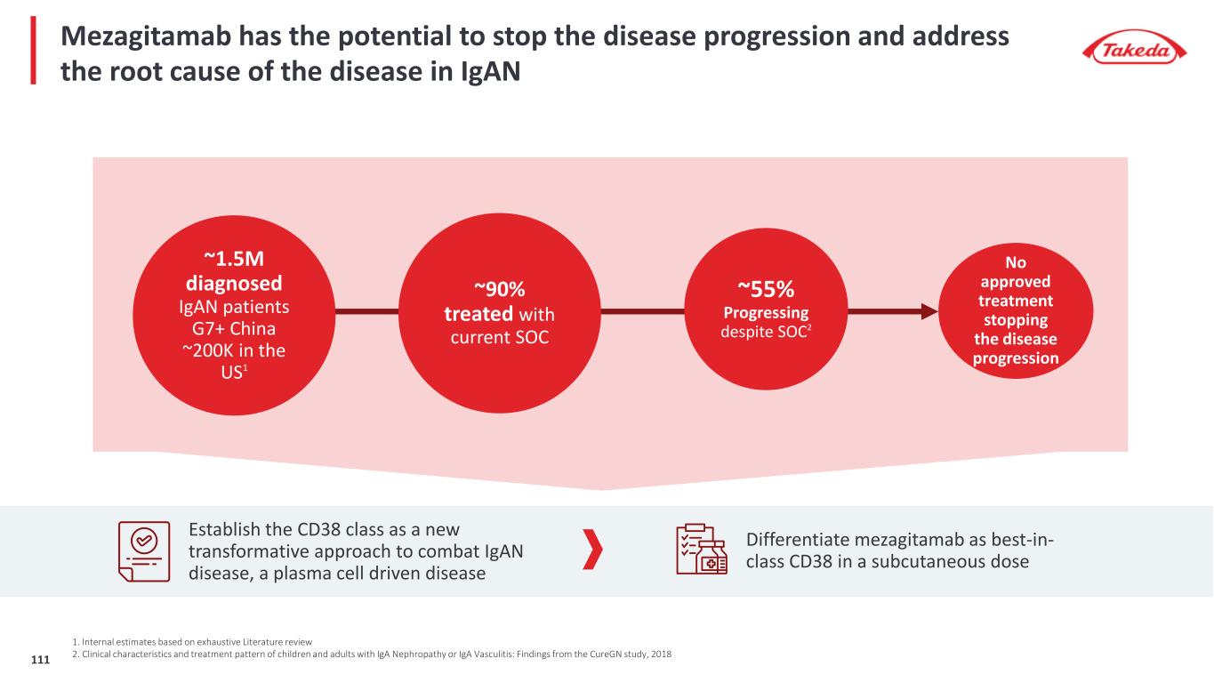 Unmet need in IgAN is for a transformative disease modifying treatment that preserves kidney function Need for disease modifying treatment that, • Stops the chronic kidney damage • Prevents the progressive loss of renal function (eGFR) • Is safe and well-tolerated • Allows for convenient dosing and extended dosing-free intervals Mezagitamab’s goal: Current SOC and approved IgAN treatments2-10 Functional cure1 -25 -20 -15 -10 -5 0 0 1 2 3 4 eG FR (m l/m in /1 .7 3m in ^2 ) Time (year) The primary goal of IgAN treatment is to halt the chronic kidney injury thereby preserving renal function (eGFR) Unmet needs remain Goal is to significantly improve over SoC nearing or achieving functional cure 1. Baba M, et al. PLoS ONE 2015; 10 (6): e0129036. 2. Lafayette R, et al. Lancet 2023; 402: 859-70. 3. Rovin BH, et al. Lancet 2023; 402 (10417): 2077-2090; 4. Li PK-T, et al. Am J Kidney Dis 2006; 47 (5): 751-60; 5. Manno C, et al. Nephrol Dial Transplant 2009; 24 (12): 3694-3701; 6. Lv J, et al. JAMA 2017; 1; 318 (5) 432-442; 7. Wheeler DC, et al. Kidney Int 2021; 100 (1): 215-224; 8. Lv J, et al. JAMA 2022; 327 (19) 1888-1898; 9. Zhang H, et al. ASN Kidney Week 2023, poster TH-PO1123; 10. Mathur M, et al. N Engl J Med 2023; 390: 20-31. 100