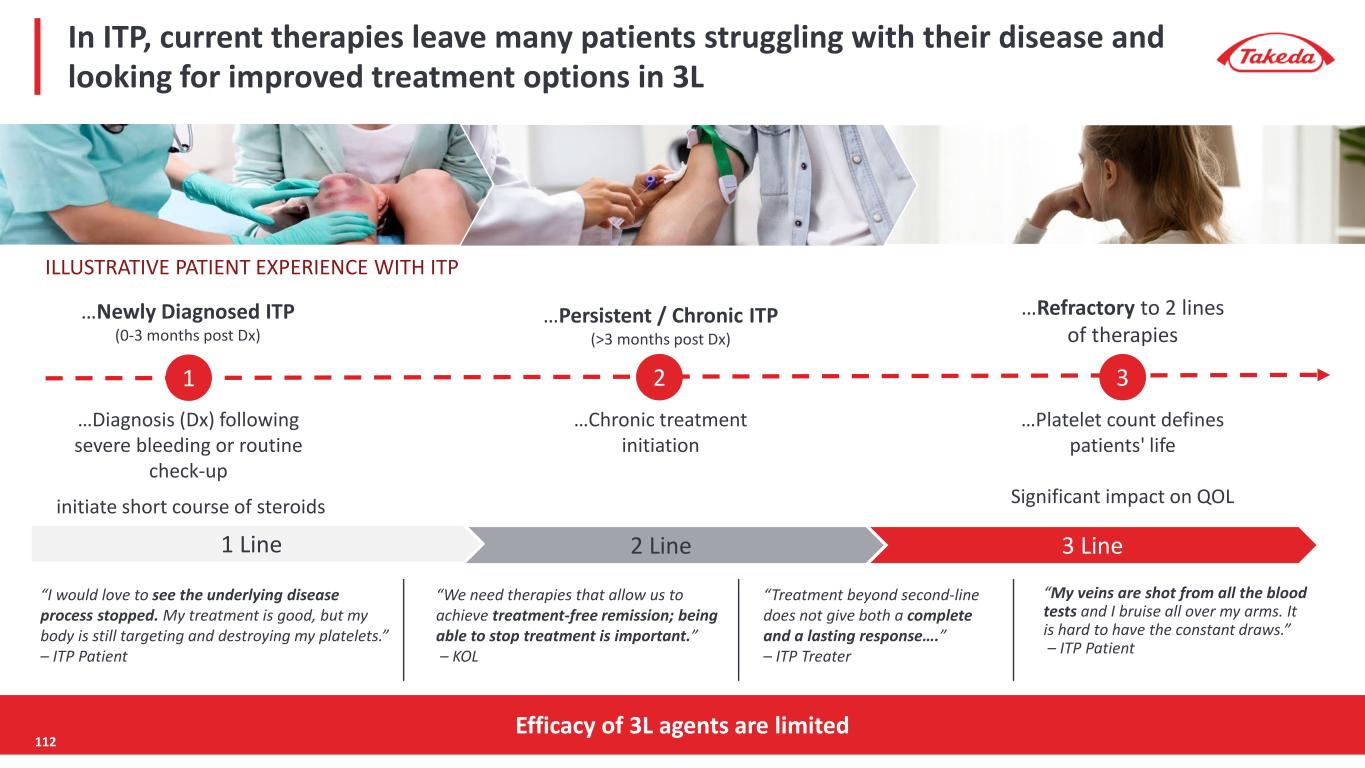In ITP, current therapies leave many patients struggling with their disease and looking for improved treatment options in 3L 1 2 3 Efficacy of 3L agents are limited ILLUSTRATIVE PATIENT EXPERIENCE WITH ITP …Newly Diagnosed ITP (0-3 months post Dx) …Persistent / Chronic ITP (>3 months post Dx) …Refractory to 2 lines of therapies 2 Line1 Line …Diagnosis (Dx) following severe bleeding or routine check-up initiate short course of steroids …Chronic treatment initiation …Platelet count defines patients' life Significant impact on QOL 3 Line “I would love to see the underlying disease process stopped. My treatment is good, but my body is still targeting and destroying my platelets.” – ITP Patient “We need therapies that allow us to achieve treatment-free remission; being able to stop treatment is important.” – KOL “Treatment beyond second-line does not give both a complete and a lasting response….” – ITP Treater “My veins are shot from all the blood tests and I bruise all over my arms. It is hard to have the constant draws.” – ITP Patient 112