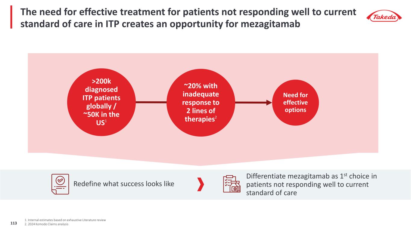 The need for effective treatment for patients not responding well to current standard of care in ITP creates an opportunity for mezagitamab Redefine what success looks like >200k diagnosed ITP patients globally / ~50K in the US1 Need for effective options ~20% with inadequate response to 2 lines of therapies2 Differentiate mezagitamab as 1st choice in patients not responding well to current standard of care 1. Internal estimates based on exhaustive Literature review 2. 2024 Komodo Claims analysis113