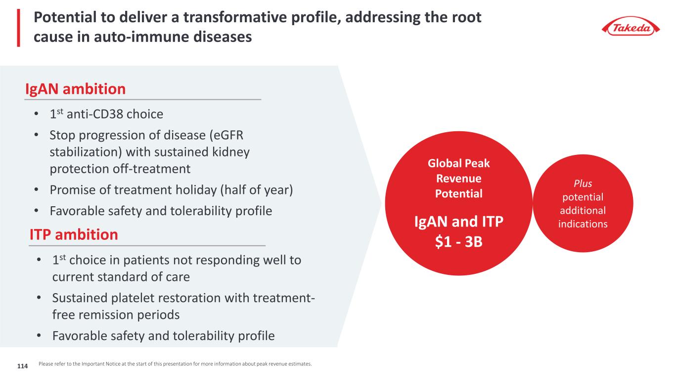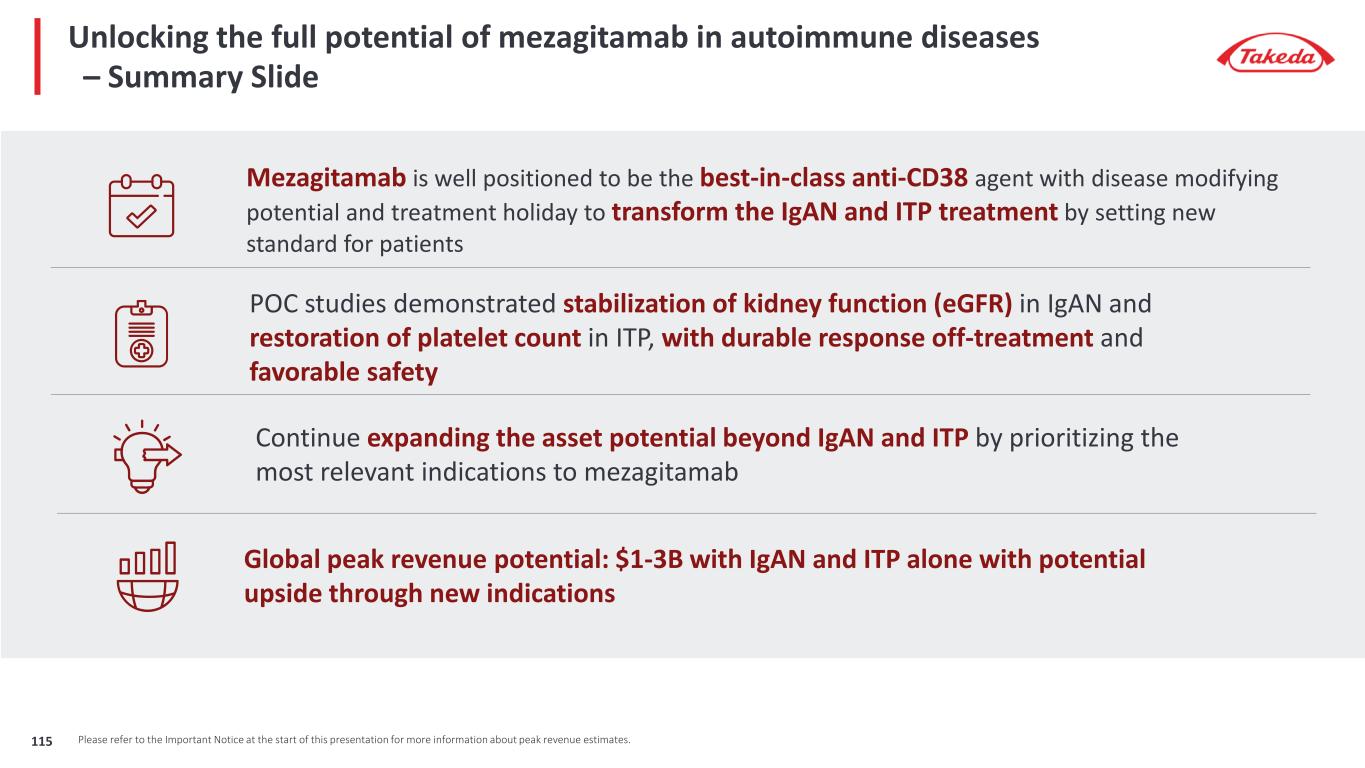 Potential to deliver a transformative profile, addressing the root cause in auto-immune diseases ITP ambition • 1st choice in patients not responding well to current standard of care • Sustained platelet restoration with treatment- free remission periods • Favorable safety and tolerability profile Global Peak Revenue Potential IgAN and ITP $1 - 3B Plus potential additional indications IgAN ambition • 1st anti-CD38 choice • Stop progression of disease (eGFR stabilization) with sustained kidney protection off-treatment • Promise of treatment holiday (half of year) • Favorable safety and tolerability profile Please refer to the Important Notice at the start of this presentation for more information about peak revenue estimates.114