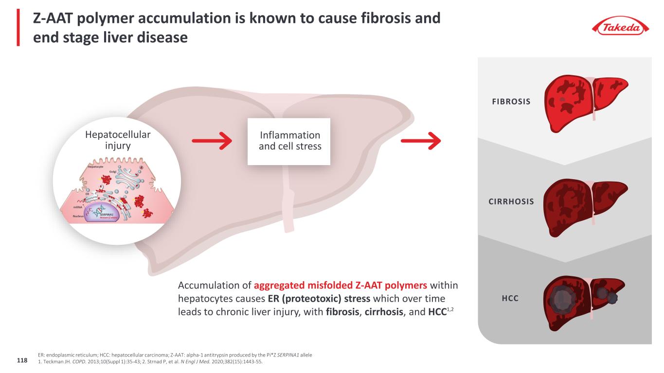 Z-AAT polymer accumulation is known to cause fibrosis and end stage liver disease ER: endoplasmic reticulum; HCC: hepatocellular carcinoma; Z-AAT: alpha-1 antitrypsin produced by the Pi*Z SERPINA1 allele 1. Teckman JH. COPD. 2013;10(Suppl 1):35-43; 2. Strnad P, et al. N Engl J Med. 2020;382(15):1443-55. FIBROSIS CIRRHOSIS HCC Inflammation and cell stress Hepatocellular injury Accumulation of aggregated misfolded Z-AAT polymers within hepatocytes causes ER (proteotoxic) stress which over time leads to chronic liver injury, with fibrosis, cirrhosis, and HCC1,2 118