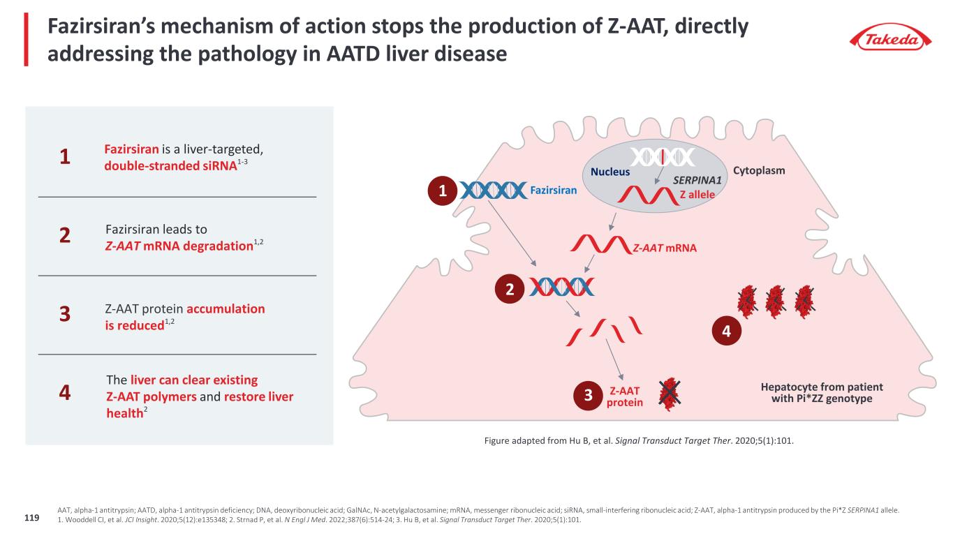Fazirsiran’s mechanism of action stops the production of Z-AAT, directly addressing the pathology in AATD liver disease AAT, alpha-1 antitrypsin; AATD, alpha-1 antitrypsin deficiency; DNA, deoxyribonucleic acid; GalNAc, N-acetylgalactosamine; mRNA, messenger ribonucleic acid; siRNA, small-interfering ribonucleic acid; Z-AAT, alpha-1 antitrypsin produced by the Pi*Z SERPINA1 allele. 1. Wooddell CI, et al. JCI Insight. 2020;5(12):e135348; 2. Strnad P, et al. N Engl J Med. 2022;387(6):514-24; 3. Hu B, et al. Signal Transduct Target Ther. 2020;5(1):101. Fazirsiran is a liver-targeted, double-stranded siRNA1-3 Fazirsiran leads to Z-AAT mRNA degradation1,2 Z-AAT protein accumulation is reduced1,2 The liver can clear existing Z-AAT polymers and restore liver health2 Figure adapted from Hu B, et al. Signal Transduct Target Ther. 2020;5(1):101. Z-AAT protein Z-AAT mRNA SERPINA1 Z allele Nucleus Cytoplasm Hepatocyte from patient with Pi*ZZ genotype 1 2 3 4 1 2 3 4 Fazirsiran 119