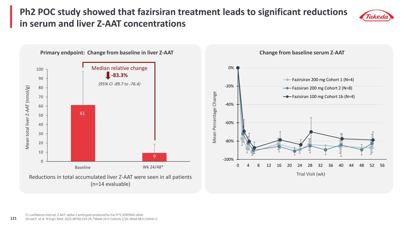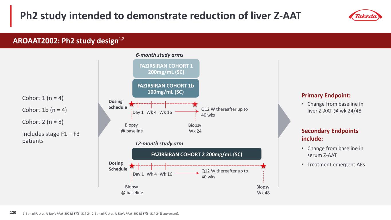 Ph2 study intended to demonstrate reduction of liver Z-AAT Cohort 1 (n = 4) Cohort 1b (n = 4) Cohort 2 (n = 8) Includes stage F1 – F3 patients Primary Endpoint: • Change from baseline in liver Z-AAT @ wk 24/48 Secondary Endpoints include: • Change from baseline in serum Z-AAT • Treatment emergent AEs Day 1 Wk 4 Wk 16 Q12 W thereafter up to 40 wks Dosing Schedule FAZIRSIRAN COHORT 1 200mg/mL (SC) Biopsy Wk 48 AROAAT2002: Ph2 study design1,2 Biopsy @ baseline 1. Strnad P, et al. N Engl J Med. 2022;387(6):514-24; 2. Strnad P, et al. N Engl J Med. 2022;387(6):514-24 (Supplement). FAZIRSIRAN COHORT 1b 100mg/mL (SC) FAZIRSIRAN COHORT 2 200mg/mL (SC) 12-month study arm 6-month study arms Day 1 Wk 4 Wk 16 Q12 W thereafter up to 40 wks Dosing Schedule Biopsy Wk 24 Biopsy @ baseline 120