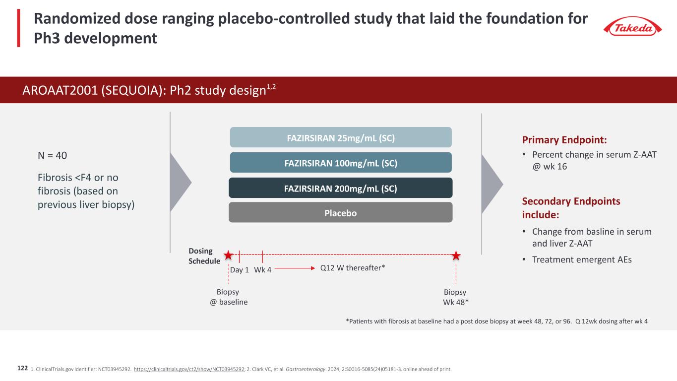 Randomized dose ranging placebo-controlled study that laid the foundation for Ph3 development N = 40 Fibrosis <F4 or no fibrosis (based on previous liver biopsy) Primary Endpoint: • Percent change in serum Z-AAT @ wk 16 Secondary Endpoints include: • Change from basline in serum and liver Z-AAT • Treatment emergent AEs Day 1 Wk 4 Q12 W thereafter* Dosing Schedule FAZIRSIRAN 25mg/mL (SC) Biopsy Wk 48* AROAAT2001 (SEQUOIA): Ph2 study design1,2 Biopsy @ baseline *Patients with fibrosis at baseline had a post dose biopsy at week 48, 72, or 96. Q 12wk dosing after wk 4 FAZIRSIRAN 100mg/mL (SC) FAZIRSIRAN 200mg/mL (SC) Placebo 1. ClinicalTrials.gov Identifier: NCT03945292. https://clinicaltrials.gov/ct2/show/NCT03945292; 2. Clark VC, et al. Gastroenterology. 2024; 2:S0016-5085(24)05181-3. online ahead of print.122
