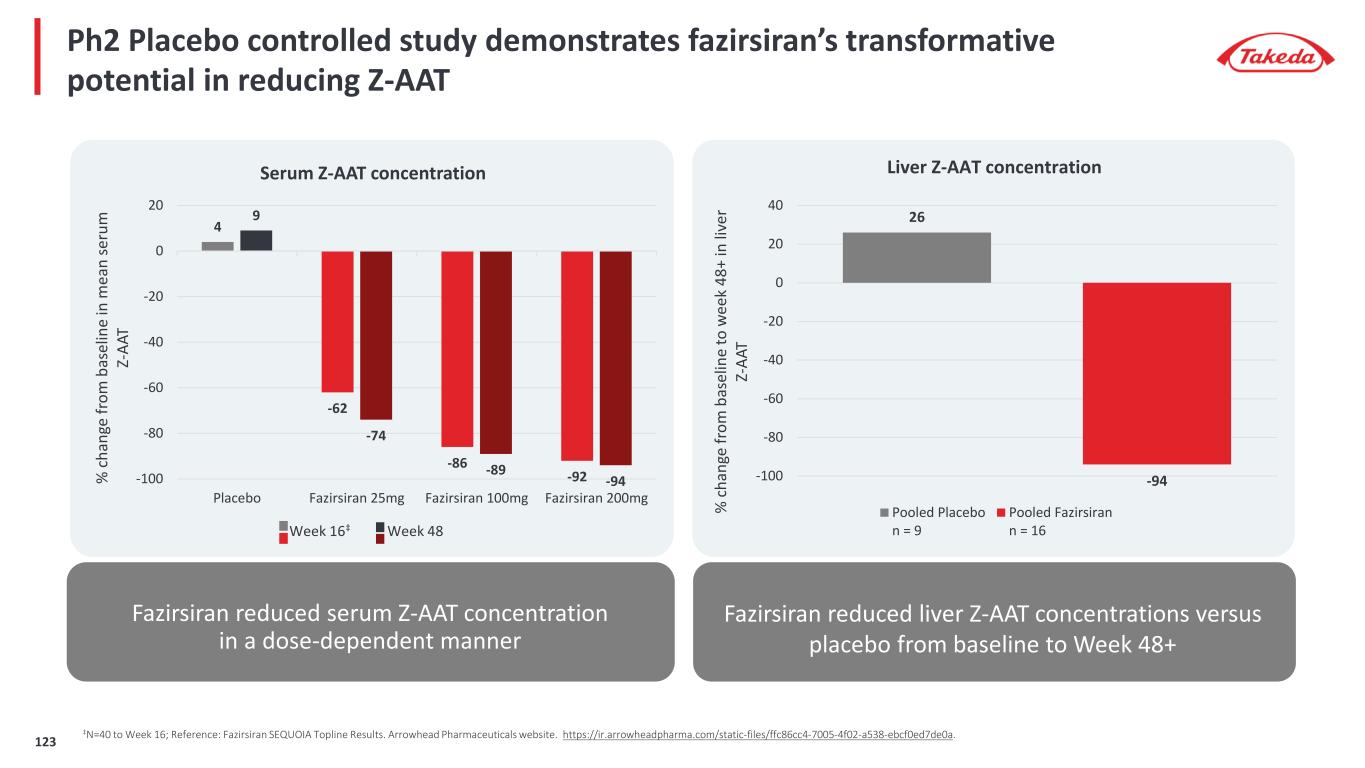 ‡N=40 to Week 16; Reference: Fazirsiran SEQUOIA Topline Results. Arrowhead Pharmaceuticals website. https://ir.arrowheadpharma.com/static-files/ffc86cc4-7005-4f02-a538-ebcf0ed7de0a. Ph2 Placebo controlled study demonstrates fazirsiran’s transformative potential in reducing Z-AAT 4 -62 -86 -92 9 -74 -89 -94-100 -80 -60 -40 -20 0 20 Placebo Fazirsiran 25mg Fazirsiran 100mg Fazirsiran 200mg % c ha ng e fr om b as el in e in m ea n se ru m Z- AA T Serum Z-AAT concentration Fazirsiran reduced serum Z-AAT concentration in a dose-dependent manner Fazirsiran reduced liver Z-AAT concentrations versus placebo from baseline to Week 48+ 26 -94-100 -80 -60 -40 -20 0 20 40 % c ha ng e fr om b as el in e to w ee k 48 + in li ve r Z- AA T Liver Z-AAT concentration Pooled Placebo n = 9 Pooled Fazirsiran n = 16Week 16‡ Week 48 123