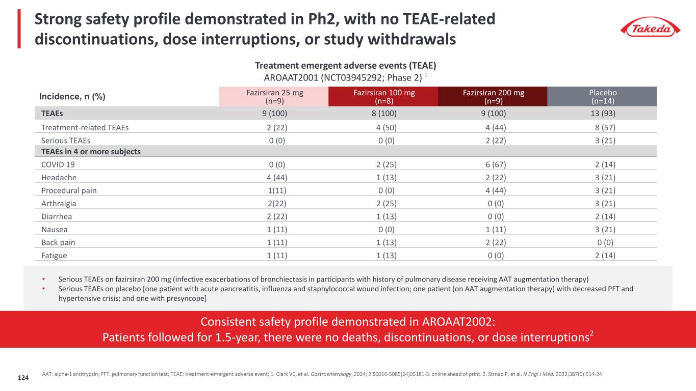 Strong safety profile demonstrated in Ph2, with no TEAE-related discontinuations, dose interruptions, or study withdrawals AAT: alpha-1 antitrypsin; PFT: pulmonary function test; TEAE: treatment-emergent adverse event; 1. Clark VC, et al. Gastroenterology. 2024; 2:S0016-5085(24)05181-3. online ahead of print. 2. Strnad P, et al. N Engl J Med. 2022;387(6):514-24 Treatment emergent adverse events (TEAE) AROAAT2001 (NCT03945292; Phase 2) 1 Incidence, n (%) Fazirsiran 25 mg (n=9) Fazirsiran 100 mg (n=8) Fazirsiran 200 mg (n=9) Placebo (n=14) TEAEs 9 (100) 8 (100) 9 (100) 13 (93) Treatment-related TEAEs 2 (22) 4 (50) 4 (44) 8 (57) Serious TEAEs 0 (0) 0 (0) 2 (22) 3 (21) TEAEs in 4 or more subjects COVID 19 0 (0) 2 (25) 6 (67) 2 (14) Headache 4 (44) 1 (13) 2 (22) 3 (21) Procedural pain 1(11) 0 (0) 4 (44) 3 (21) Arthralgia 2(22) 2 (25) 0 (0) 3 (21) Diarrhea 2 (22) 1 (13) 0 (0) 2 (14) Nausea 1 (11) 0 (0) 1 (11) 3 (21) Back pain 1 (11) 1 (13) 2 (22) 0 (0) Fatigue 1 (11) 1 (13) 0 (0) 2 (14) Consistent safety profile demonstrated in AROAAT2002: Patients followed for 1.5-year, there were no deaths, discontinuations, or dose interruptions2 • Serious TEAEs on fazirsiran 200 mg (infective exacerbations of bronchiectasis in participants with history of pulmonary disease receiving AAT augmentation therapy) • Serious TEAEs on placebo [one patient with acute pancreatitis, influenza and staphylococcal wound infection; one patient (on AAT augmentation therapy) with decreased PFT and hypertensive crisis; and one with presyncope] 124