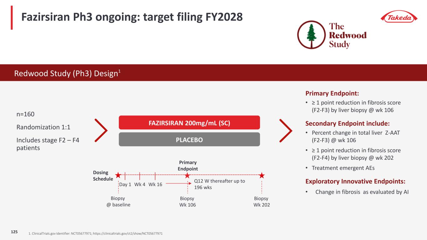 Fazirsiran Ph3 ongoing: target filing FY2028 n=160 Randomization 1:1 Includes stage F2 – F4 patients Day 1 Wk 4 Wk 16 Q12 W thereafter up to 196 wks Dosing Schedule FAZIRSIRAN 200mg/mL (SC) PLACEBO Biopsy Wk 106 Biopsy Wk 202 Primary Endpoint Redwood Study (Ph3) Design1 Biopsy @ baseline Primary Endpoint: • ≥ 1 point reduction in fibrosis score (F2-F3) by liver biopsy @ wk 106 Secondary Endpoint include: • Percent change in total liver Z-AAT (F2-F3) @ wk 106 • ≥ 1 point reduction in fibrosis score (F2-F4) by liver biopsy @ wk 202 • Treatment emergent AEs Exploratory Innovative Endpoints: • Change in fibrosis as evaluated by AI 1. ClinicalTrials.gov Identifier: NCT05677971; https://clinicaltrials.gov/ct2/show/NCT05677971 125