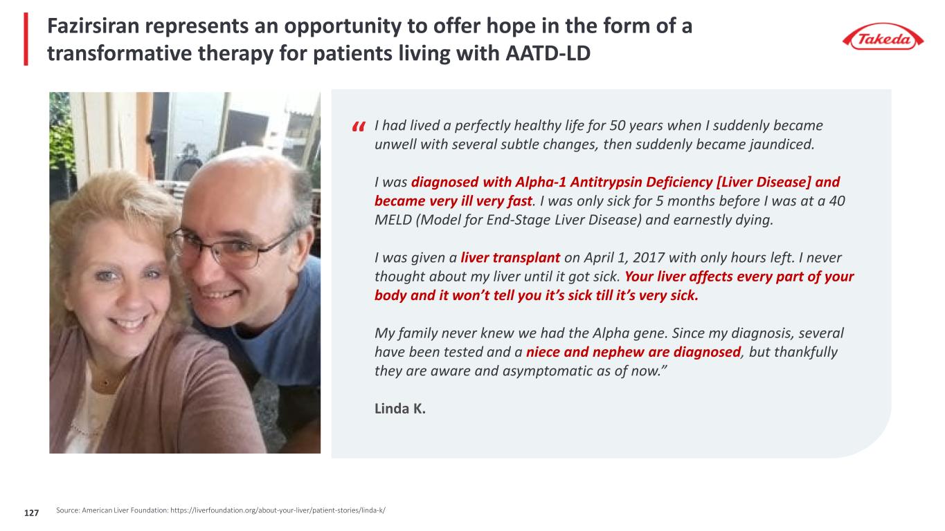 Fazirsiran represents an opportunity to offer hope in the form of a transformative therapy for patients living with AATD-LD Source: American Liver Foundation: https://liverfoundation.org/about-your-liver/patient-stories/linda-k/ I had lived a perfectly healthy life for 50 years when I suddenly became unwell with several subtle changes, then suddenly became jaundiced. I was diagnosed with Alpha-1 Antitrypsin Deficiency [Liver Disease] and became very ill very fast. I was only sick for 5 months before I was at a 40 MELD (Model for End-Stage Liver Disease) and earnestly dying. I was given a liver transplant on April 1, 2017 with only hours left. I never thought about my liver until it got sick. Your liver affects every part of your body and it won’t tell you it’s sick till it’s very sick. My family never knew we had the Alpha gene. Since my diagnosis, several have been tested and a niece and nephew are diagnosed, but thankfully they are aware and asymptomatic as of now.” Linda K. “ 127