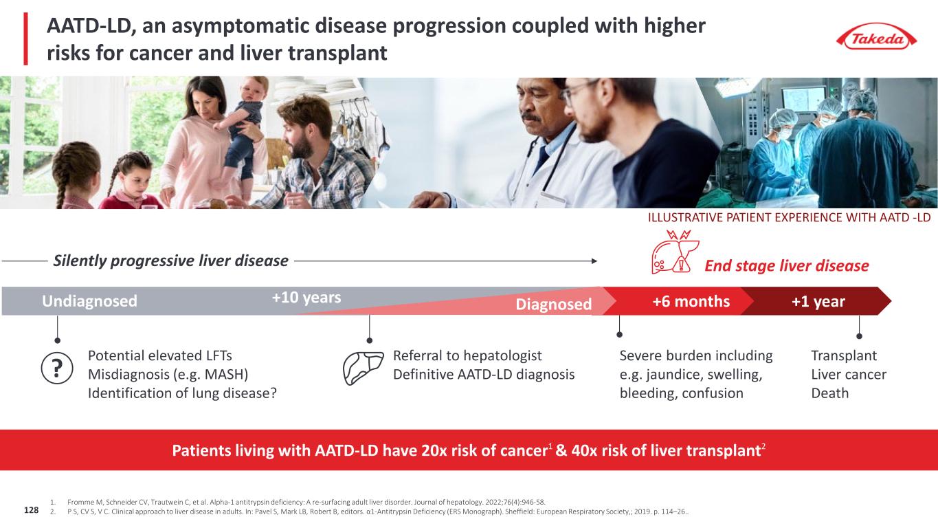 Patients living with AATD-LD have 20x risk of cancer1 & 40x risk of liver transplant2 AATD-LD, an asymptomatic disease progression coupled with higher risks for cancer and liver transplant ILLUSTRATIVE PATIENT EXPERIENCE WITH AATD -LD End stage liver diseaseSilently progressive liver disease Referral to hepatologist Definitive AATD-LD diagnosis +6 months +1 year Potential elevated LFTs Misdiagnosis (e.g. MASH) Identification of lung disease? Severe burden including e.g. jaundice, swelling, bleeding, confusion +1 year Undiagnosed Diagnosed ? +10 years Transplant Liver cancer Death 1. Fromme M, Schneider CV, Trautwein C, et al. Alpha-1 antitrypsin deficiency: A re-surfacing adult liver disorder. Journal of hepatology. 2022;76(4):946-58. 2. P S, CV S, V C. Clinical approach to liver disease in adults. In: Pavel S, Mark LB, Robert B, editors. α1-Antitrypsin Deficiency (ERS Monograph). Sheffield: European Respiratory Society,; 2019. p. 114–26..128
