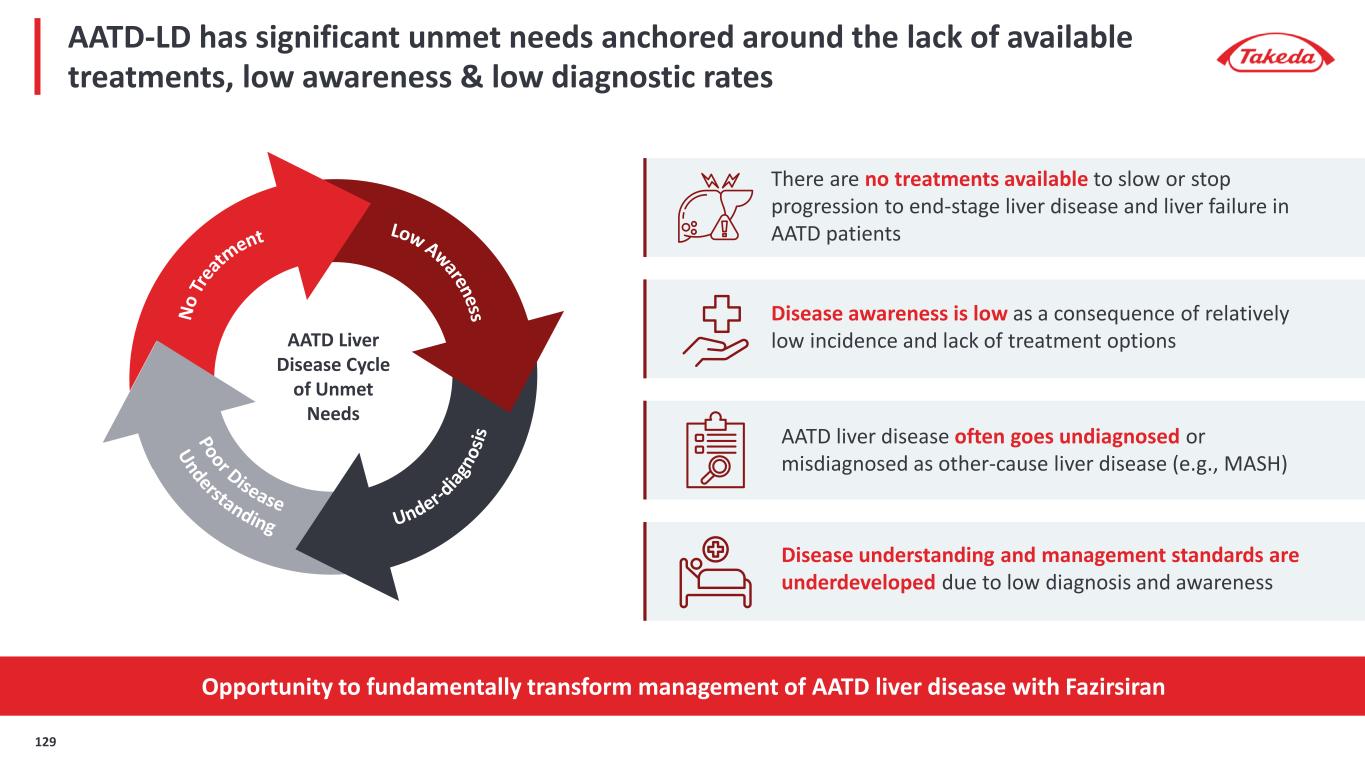 AATD-LD has significant unmet needs anchored around the lack of available treatments, low awareness & low diagnostic rates AATD Liver Disease Cycle of Unmet Needs There are no treatments available to slow or stop progression to end-stage liver disease and liver failure in AATD patients Disease awareness is low as a consequence of relatively low incidence and lack of treatment options AATD liver disease often goes undiagnosed or misdiagnosed as other-cause liver disease (e.g., MASH) Disease understanding and management standards are underdeveloped due to low diagnosis and awareness Opportunity to fundamentally transform management of AATD liver disease with Fazirsiran 129