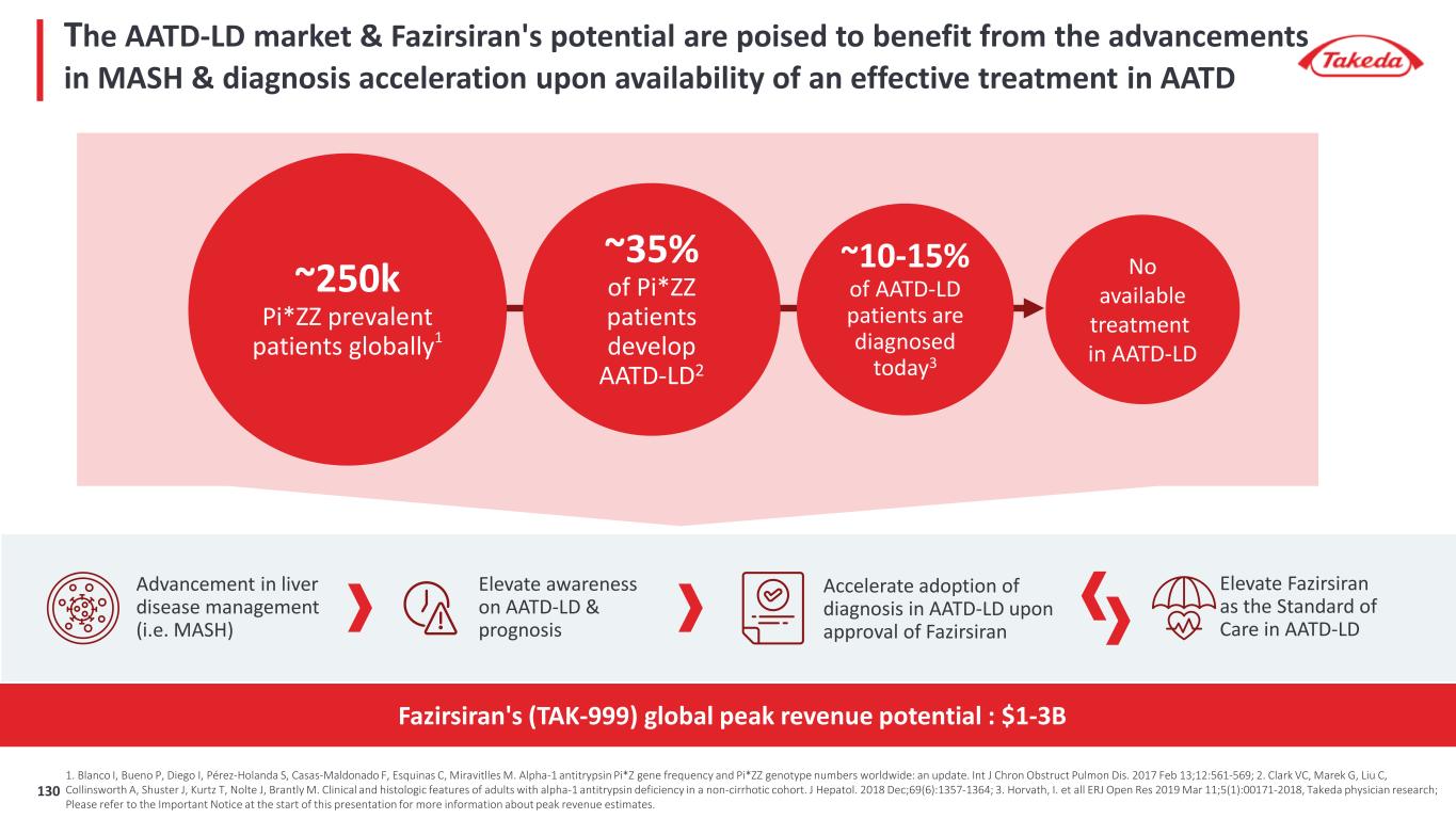 The AATD-LD market & Fazirsiran's potential are poised to benefit from the advancements in MASH & diagnosis acceleration upon availability of an effective treatment in AATD Accelerate adoption of diagnosis in AATD-LD upon approval of Fazirsiran Elevate awareness on AATD-LD & prognosis Advancement in liver disease management (i.e. MASH) Elevate Fazirsiran as the Standard of Care in AATD-LD 1. Blanco I, Bueno P, Diego I, Pérez-Holanda S, Casas-Maldonado F, Esquinas C, Miravitlles M. Alpha-1 antitrypsin Pi*Z gene frequency and Pi*ZZ genotype numbers worldwide: an update. Int J Chron Obstruct Pulmon Dis. 2017 Feb 13;12:561-569; 2. Clark VC, Marek G, Liu C, Collinsworth A, Shuster J, Kurtz T, Nolte J, Brantly M. Clinical and histologic features of adults with alpha-1 antitrypsin deficiency in a non-cirrhotic cohort. J Hepatol. 2018 Dec;69(6):1357-1364; 3. Horvath, I. et all ERJ Open Res 2019 Mar 11;5(1):00171-2018, Takeda physician research; Please refer to the Important Notice at the start of this presentation for more information about peak revenue estimates. Fazirsiran's (TAK-999) global peak revenue potential : $1-3B ~250k Pi*ZZ prevalent patients globally1 ~35% of Pi*ZZ patients develop AATD-LD2 ~10-15% of AATD-LD patients are diagnosed today3 No available treatment in AATD-LD 130