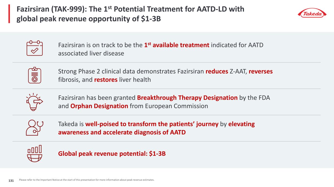 Fazirsiran is on track to be the 1st available treatment indicated for AATD associated liver disease Strong Phase 2 clinical data demonstrates Fazirsiran reduces Z-AAT, reverses fibrosis, and restores liver health Fazirsiran has been granted Breakthrough Therapy Designation by the FDA and Orphan Designation from European Commission Takeda is well-poised to transform the patients’ journey by elevating awareness and accelerate diagnosis of AATD Fazirsiran (TAK-999): The 1st Potential Treatment for AATD-LD with global peak revenue opportunity of $1-3B Global peak revenue potential: $1-3B Please refer to the Important Notice at the start of this presentation for more information about peak revenue estimates.131