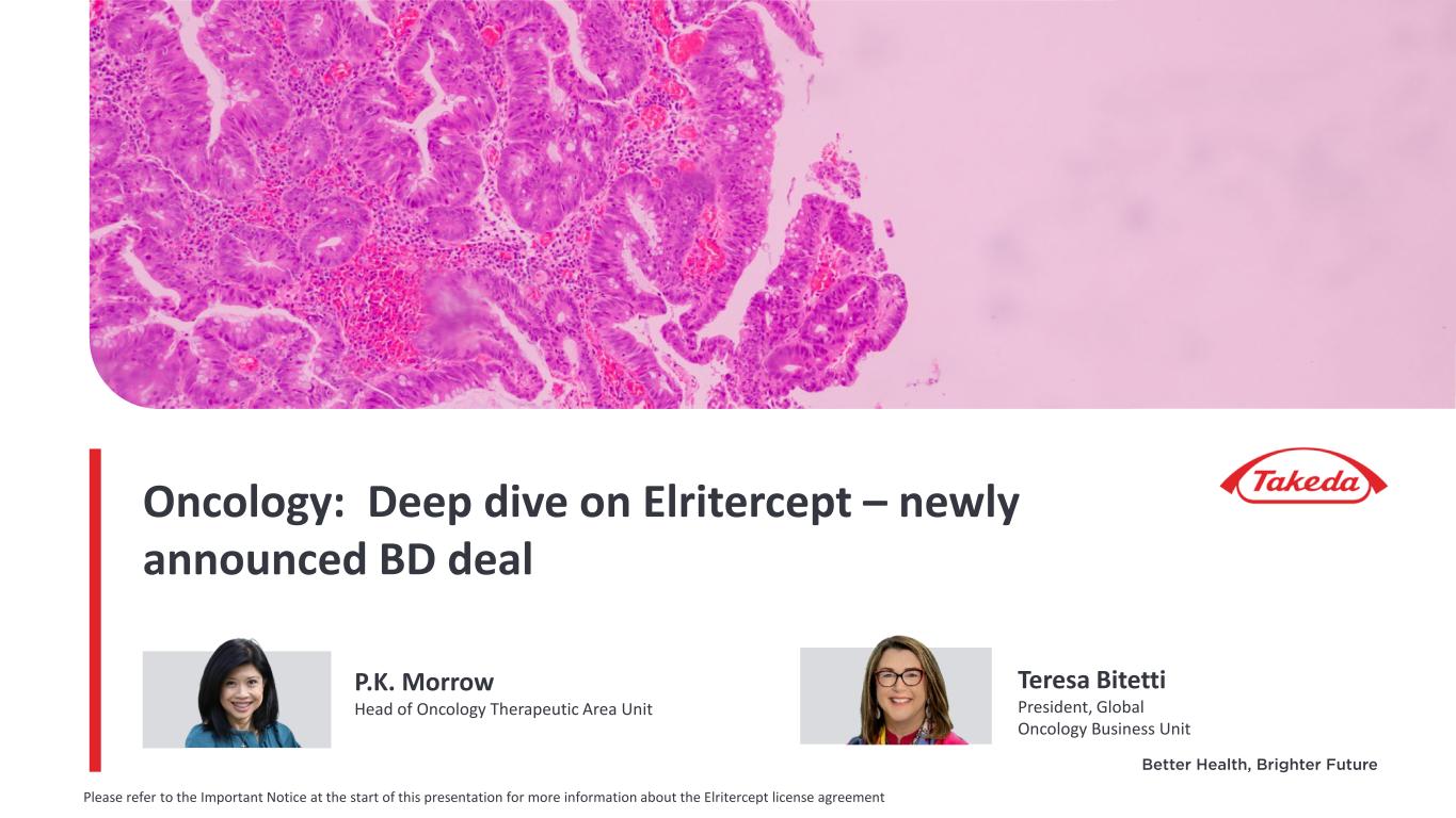 Oncology: Deep dive on Elritercept – newly announced BD deal P.K. Morrow Head of Oncology Therapeutic Area Unit Please refer to the Important Notice at the start of this presentation for more information about the Elritercept license agreement Teresa Bitetti President, Global Oncology Business Unit