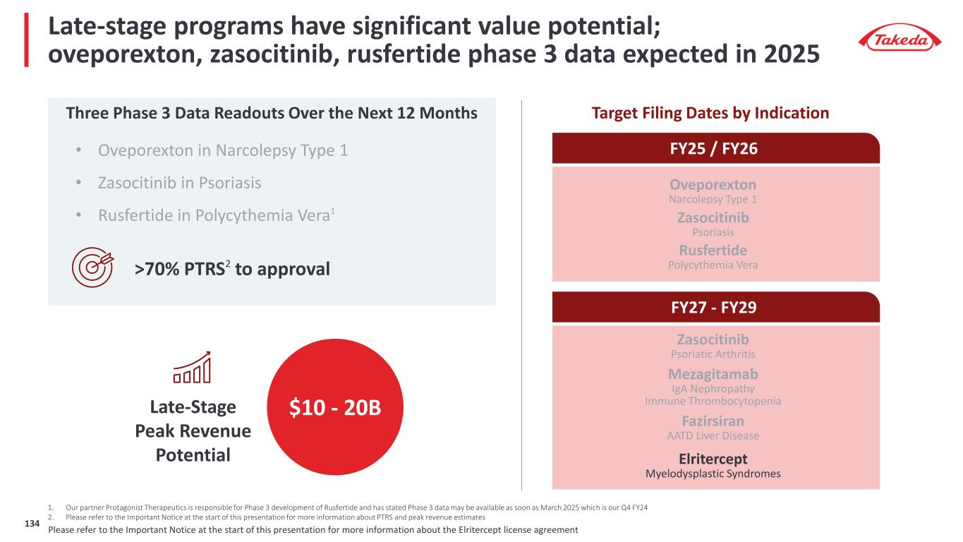 Late-stage programs have significant value potential; oveporexton, zasocitinib, rusfertide phase 3 data expected in 2025 Three Phase 3 Data Readouts Over the Next 12 Months Late-Stage Peak Revenue Potential >70% PTRS2 to approval $10 - 20B Fazirsiran AATD Liver Disease Elritercept Myelodysplastic Syndromes Zasocitinib Psoriatic Arthritis Mezagitamab IgA Nephropathy Immune Thrombocytopenia FY25 / FY26 Target Filing Dates by Indication FY27 - FY29 • Oveporexton in Narcolepsy Type 1 • Zasocitinib in Psoriasis • Rusfertide in Polycythemia Vera1 Oveporexton Narcolepsy Type 1 Rusfertide Polycythemia Vera Zasocitinib Psoriasis 1. Our partner Protagonist Therapeutics is responsible for Phase 3 development of Rusfertide and has stated Phase 3 data may be available as soon as March 2025 which is our Q4 FY24 2. Please refer to the Important Notice at the start of this presentation for more information about PTRS and peak revenue estimates Please refer to the Important Notice at the start of this presentation for more information about the Elritercept license agreement134