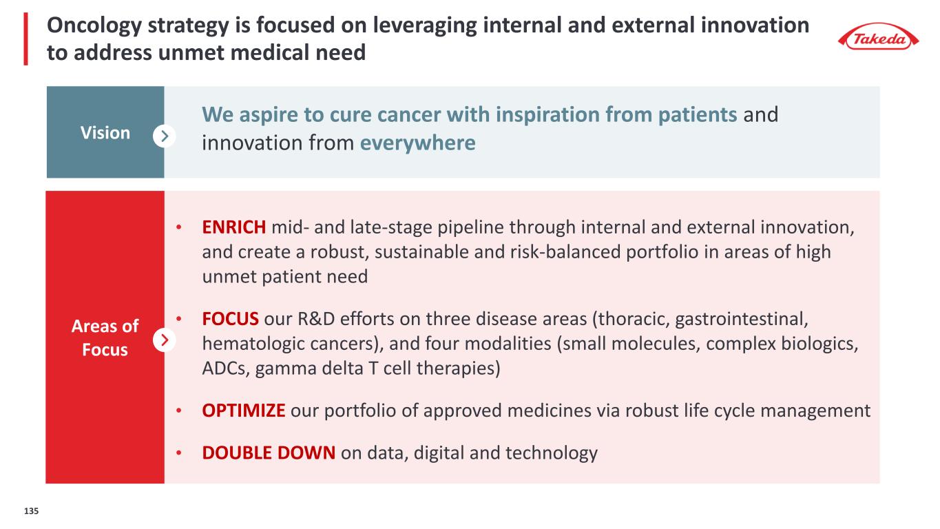 Oncology strategy is focused on leveraging internal and external innovation to address unmet medical need We aspire to cure cancer with inspiration from patients and innovation from everywhere Areas of Focus Vision • ENRICH mid- and late-stage pipeline through internal and external innovation, and create a robust, sustainable and risk-balanced portfolio in areas of high unmet patient need • FOCUS our R&D efforts on three disease areas (thoracic, gastrointestinal, hematologic cancers), and four modalities (small molecules, complex biologics, ADCs, gamma delta T cell therapies) • OPTIMIZE our portfolio of approved medicines via robust life cycle management • DOUBLE DOWN on data, digital and technology 135