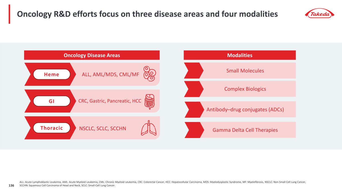 Thoracic NSCLC, SCLC, SCCHN CRC, Gastric, Pancreatic, HCCGI ALL, AML/MDS, CML/MFHeme Complex Biologics Antibody–drug conjugates (ADCs) Small Molecules Gamma Delta Cell Therapies Oncology Disease Areas Modalities ALL: Acute Lymphoblastic Leukemia, AML: Acute Myeloid Leukemia, CML: Chronic Myeloid Leukemia, CRC: Colorectal Cancer, HCC: Hepatocellular Carcinoma, MDS: Myelodysplastic Syndrome, MF: Myelofibrosis, NSCLC: Non-Small Cell Lung Cancer, SCCHN: Squamous Cell Carcinoma of Head and Neck, SCLC: Small-Cell Lung Cancer. Oncology R&D efforts focus on three disease areas and four modalities 136