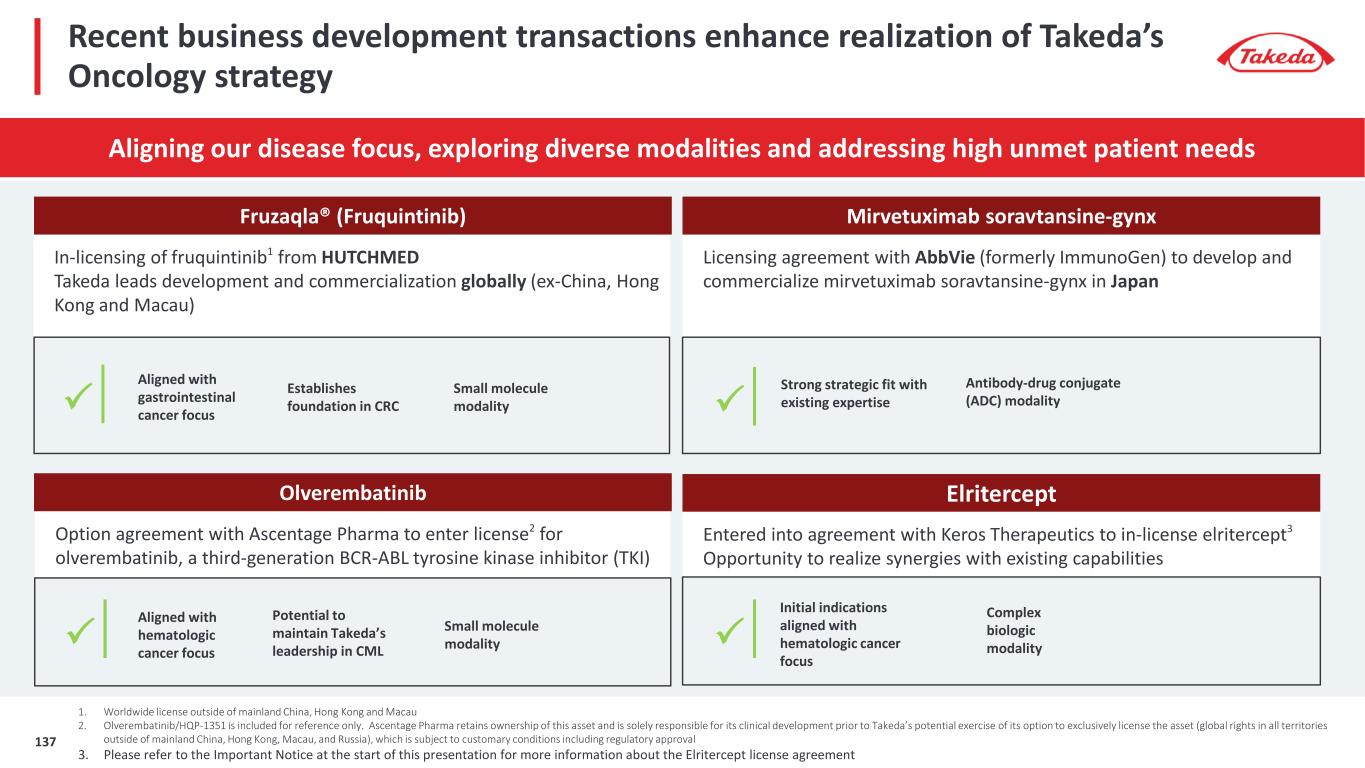Recent business development transactions enhance realization of Takeda’s Oncology strategy Fruzaqla® (Fruquintinib) In-licensing of fruquintinib1 from HUTCHMED Takeda leads development and commercialization globally (ex-China, Hong Kong and Macau) Mirvetuximab soravtansine-gynx Licensing agreement with AbbVie (formerly ImmunoGen) to develop and commercialize mirvetuximab soravtansine-gynx in Japan Olverembatinib Option agreement with Ascentage Pharma to enter license2 for olverembatinib, a third-generation BCR-ABL tyrosine kinase inhibitor (TKI)  Elritercept Entered into agreement with Keros Therapeutics to in-license elritercept3 Opportunity to realize synergies with existing capabilities 1. Worldwide license outside of mainland China, Hong Kong and Macau 2. Olverembatinib/HQP-1351 is included for reference only. Ascentage Pharma retains ownership of this asset and is solely responsible for its clinical development prior to Takeda’s potential exercise of its option to exclusively license the asset (global rights in all territories outside of mainland China, Hong Kong, Macau, and Russia), which is subject to customary conditions including regulatory approval 3. Please refer to the Important Notice at the start of this presentation for more information about the Elritercept license agreement Aligned with hematologic cancer focus Potential to maintain Takeda’s leadership in CML Small molecule modality Initial indications aligned with hematologic cancer focus  Complex biologic modality Strong strategic fit with existing expertise Antibody-drug conjugate (ADC) modality Aligned with gastrointestinal cancer focus Establishes foundation in CRC Small molecule modality Aligning our disease focus, exploring diverse modalities and addressing high unmet patient needs 137