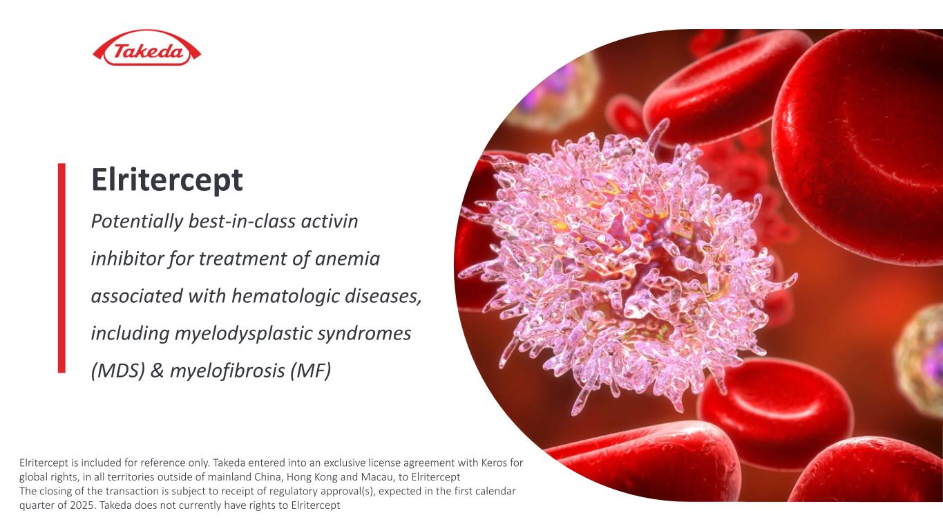 Elritercept Potentially best-in-class activin inhibitor for treatment of anemia associated with hematologic diseases, including myelodysplastic syndromes (MDS) & myelofibrosis (MF) Elritercept is included for reference only. Takeda entered into an exclusive license agreement with Keros for global rights, in all territories outside of mainland China, Hong Kong and Macau, to Elritercept The closing of the transaction is subject to receipt of regulatory approval(s), expected in the first calendar quarter of 2025. Takeda does not currently have rights to Elritercept