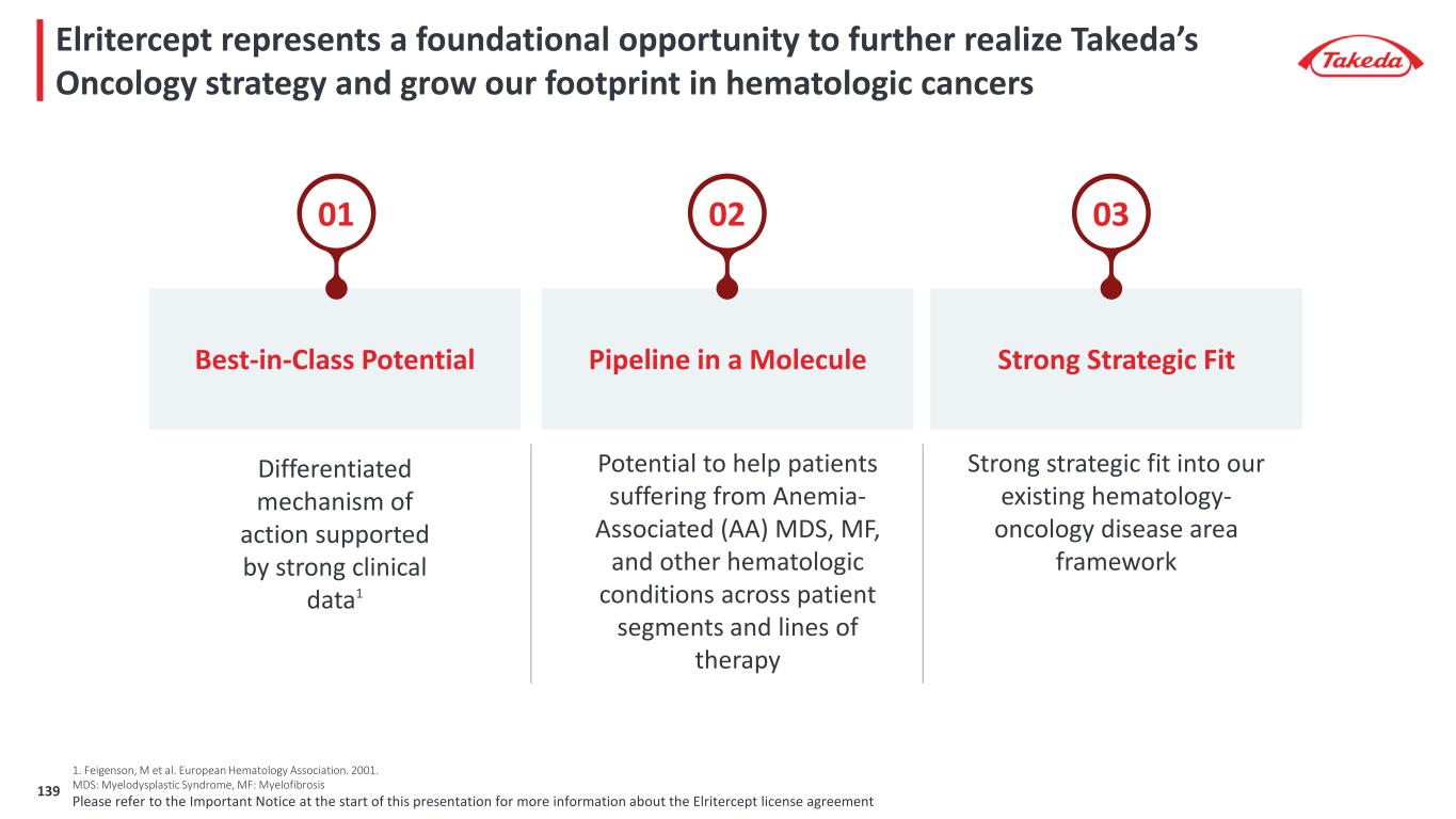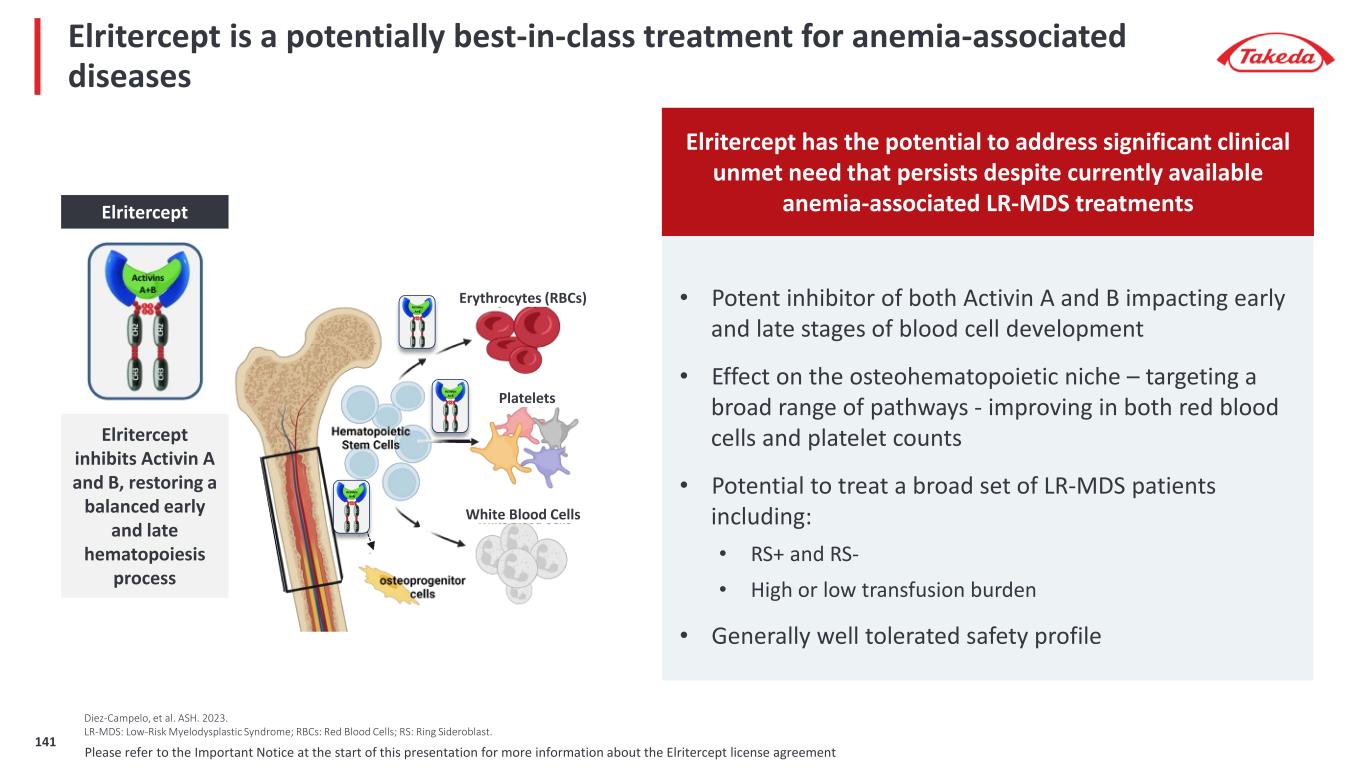Elritercept represents a foundational opportunity to further realize Takeda’s Oncology strategy and grow our footprint in hematologic cancers 1. Feigenson, M et al. European Hematology Association. 2001. MDS: Myelodysplastic Syndrome, MF: Myelofibrosis Please refer to the Important Notice at the start of this presentation for more information about the Elritercept license agreement Best-in-Class Potential Pipeline in a Molecule Strong Strategic Fit Potential to help patients suffering from Anemia- Associated (AA) MDS, MF, and other hematologic conditions across patient segments and lines of therapy Strong strategic fit into our existing hematology- oncology disease area framework 01 02 03 Differentiated mechanism of action supported by strong clinical data1 139