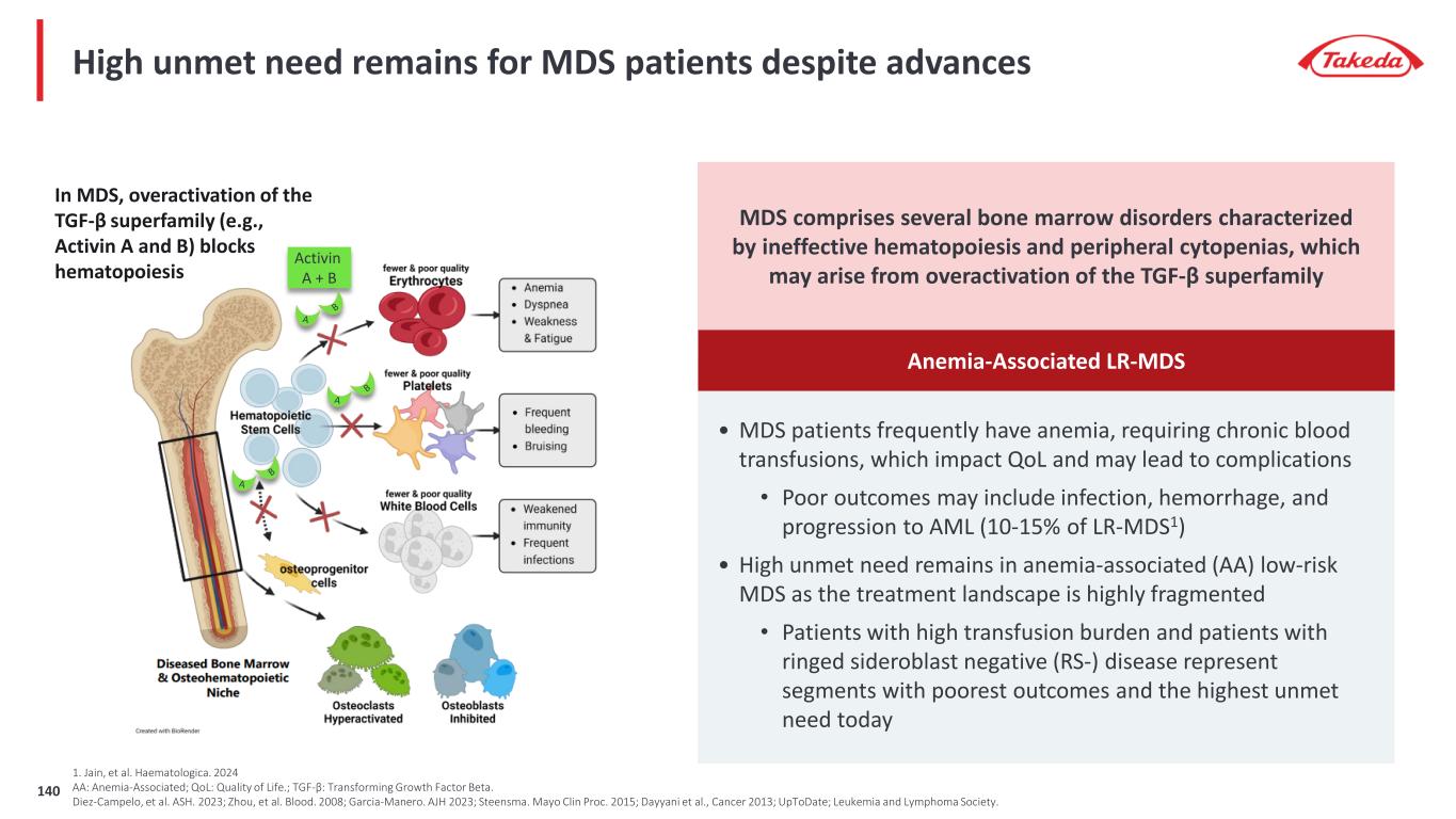 In MDS, overactivation of the TGF-β superfamily (e.g., Activin A and B) blocks hematopoiesis Activin A + B High unmet need remains for MDS patients despite advances 1. Jain, et al. Haematologica. 2024 AA: Anemia-Associated; QoL: Quality of Life.; TGF-β: Transforming Growth Factor Beta. Diez-Campelo, et al. ASH. 2023; Zhou, et al. Blood. 2008; Garcia-Manero. AJH 2023; Steensma. Mayo Clin Proc. 2015; Dayyani et al., Cancer 2013; UpToDate; Leukemia and Lymphoma Society. Anemia-Associated LR-MDS MDS comprises several bone marrow disorders characterized by ineffective hematopoiesis and peripheral cytopenias, which may arise from overactivation of the TGF-β superfamily • MDS patients frequently have anemia, requiring chronic blood transfusions, which impact QoL and may lead to complications • Poor outcomes may include infection, hemorrhage, and progression to AML (10-15% of LR-MDS1) • High unmet need remains in anemia-associated (AA) low-risk MDS as the treatment landscape is highly fragmented • Patients with high transfusion burden and patients with ringed sideroblast negative (RS-) disease represent segments with poorest outcomes and the highest unmet need today 140