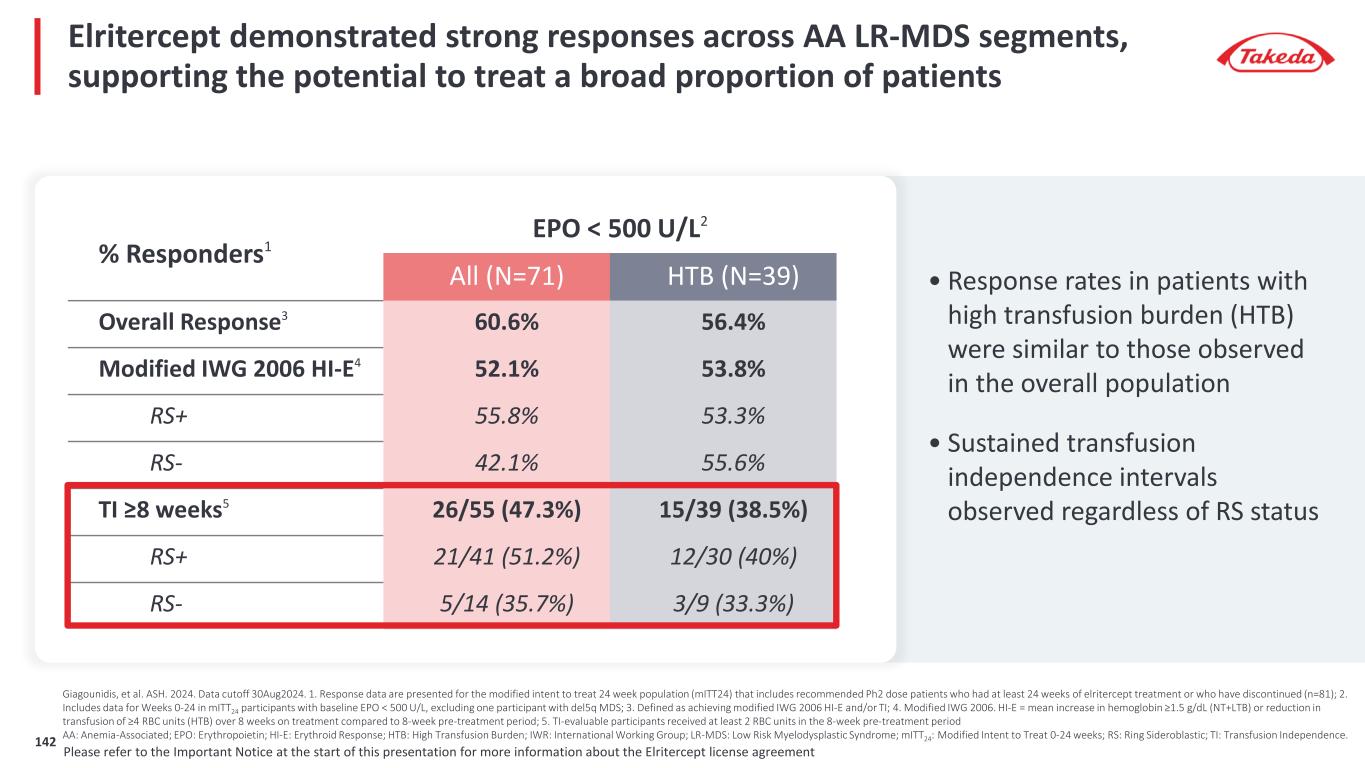 % Responders1 EPO < 500 U/L2 All (N=71) HTB (N=39) Overall Response3 60.6% 56.4% Modified IWG 2006 HI-E4 52.1% 53.8% RS+ 55.8% 53.3% RS- 42.1% 55.6% TI ≥8 weeks5 26/55 (47.3%) 15/39 (38.5%) RS+ 21/41 (51.2%) 12/30 (40%) RS- 5/14 (35.7%) 3/9 (33.3%) Elritercept demonstrated strong responses across AA LR-MDS segments, supporting the potential to treat a broad proportion of patients • Response rates in patients with high transfusion burden (HTB) were similar to those observed in the overall population • Sustained transfusion independence intervals observed regardless of RS status Please refer to the Important Notice at the start of this presentation for more information about the Elritercept license agreement Giagounidis, et al. ASH. 2024. Data cutoff 30Aug2024. 1. Response data are presented for the modified intent to treat 24 week population (mITT24) that includes recommended Ph2 dose patients who had at least 24 weeks of elritercept treatment or who have discontinued (n=81); 2. Includes data for Weeks 0-24 in mITT24 participants with baseline EPO < 500 U/L, excluding one participant with del5q MDS; 3. Defined as achieving modified IWG 2006 HI-E and/or TI; 4. Modified IWG 2006. HI-E = mean increase in hemoglobin ≥1.5 g/dL (NT+LTB) or reduction in transfusion of ≥4 RBC units (HTB) over 8 weeks on treatment compared to 8-week pre-treatment period; 5. TI-evaluable participants received at least 2 RBC units in the 8-week pre-treatment period AA: Anemia-Associated; EPO: Erythropoietin; HI-E: Erythroid Response; HTB: High Transfusion Burden; IWR: International Working Group; LR-MDS: Low Risk Myelodysplastic Syndrome; mITT24: Modified Intent to Treat 0-24 weeks; RS: Ring Sideroblastic; TI: Transfusion Independence.142