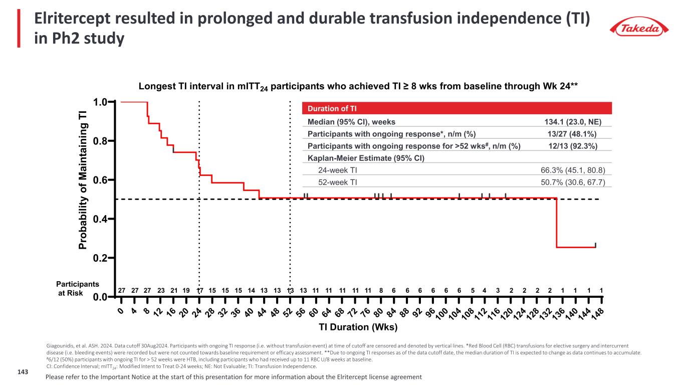 0 4 8 12 16 20 24 28 32 36 40 44 48 52 56 60 64 68 72 76 80 84 88 92 96 10 0 10 4 10 8 11 2 11 6 12 0 12 4 12 8 13 2 13 6 14 0 14 4 14 8 0.0 0.2 0.4 0.6 0.8 1.0 Longest TI interval in mITT24 participants who achieved TI ≥ 8 wks from baseline through Wk 24** TI Duration (Wks) Pr ob ab ili ty o f M ai nt ai ni ng T I Participants at Risk 27 27 27 23 21 19 17 15 15 15 14 13 13 13 13 11 66668 6 5 4 3 2 2 2 2 111 11 11 11 6 1 1 1 Elritercept resulted in prolonged and durable transfusion independence (TI) in Ph2 study Giagounidis, et al. ASH. 2024. Data cutoff 30Aug2024. Participants with ongoing TI response (i.e. without transfusion event) at time of cutoff are censored and denoted by vertical lines. *Red Blood Cell (RBC) transfusions for elective surgery and intercurrent disease (i.e. bleeding events) were recorded but were not counted towards baseline requirement or efficacy assessment. **Due to ongoing TI responses as of the data cutoff date, the median duration of TI is expected to change as data continues to accumulate. #6/12 (50%) participants with ongoing TI for > 52 weeks were HTB, including participants who had received up to 11 RBC U/8 weeks at baseline. CI: Confidence Interval; mITT24: Modified Intent to Treat 0-24 weeks; NE: Not Evaluable; TI: Transfusion Independence. Duration of TI Median (95% CI), weeks 134.1 (23.0, NE) Participants with ongoing response*, n/m (%) 13/27 (48.1%) Participants with ongoing response for >52 wks#, n/m (%) 12/13 (92.3%) Kaplan-Meier Estimate (95% CI) 24-week TI 66.3% (45.1, 80.8) 52-week TI 50.7% (30.6, 67.7) Please refer to the Important Notice at the start of this presentation for more information about the Elritercept license agreement 143