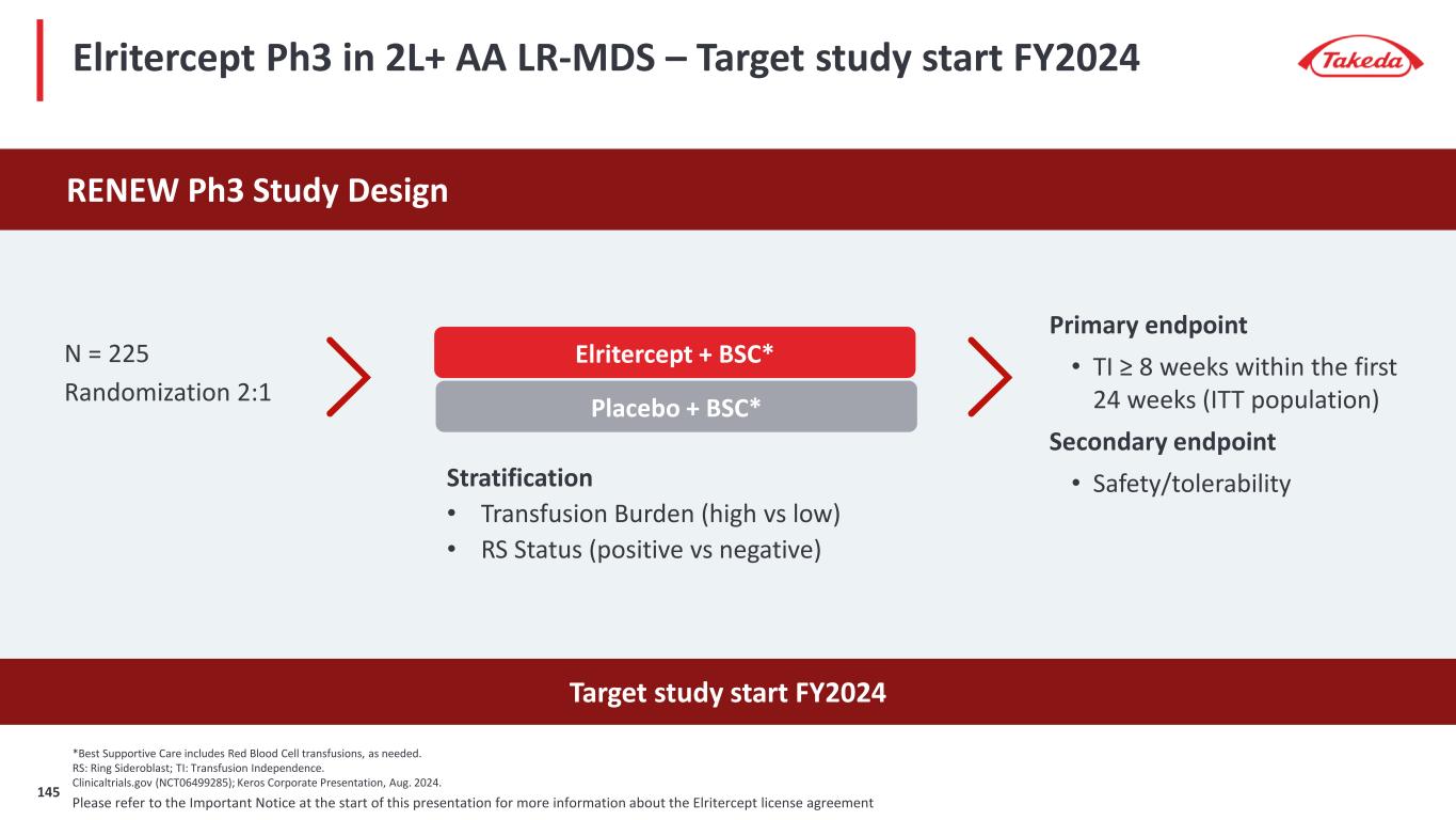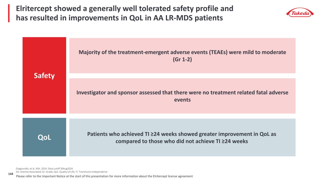 Elritercept showed a generally well tolerated safety profile and has resulted in improvements in QoL in AA LR-MDS patients Giagounidis, et al. ASH. 2024. Data cutoff 30Aug2024. AA: Anemia-Associated; Gr: Grade; QoL: Quality of Life; TI: Transfusion Independence Patients who achieved TI ≥24 weeks showed greater improvement in QoL as compared to those who did not achieve TI ≥24 weeks Investigator and sponsor assessed that there were no treatment related fatal adverse events Majority of the treatment-emergent adverse events (TEAEs) were mild to moderate (Gr 1-2) Safety QoL Please refer to the Important Notice at the start of this presentation for more information about the Elritercept license agreement 144