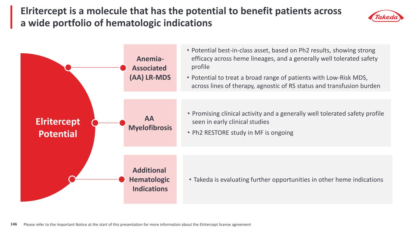 AA Myelofibrosis • Potential best-in-class asset, based on Ph2 results, showing strong efficacy across heme lineages, and a generally well tolerated safety profile • Potential to treat a broad range of patients with Low-Risk MDS, across lines of therapy, agnostic of RS status and transfusion burden Elritercept is a molecule that has the potential to benefit patients across a wide portfolio of hematologic indications Elritercept Potential Additional Hematologic Indications Anemia- Associated (AA) LR-MDS • Takeda is evaluating further opportunities in other heme indications • Promising clinical activity and a generally well tolerated safety profile seen in early clinical studies • Ph2 RESTORE study in MF is ongoing Please refer to the Important Notice at the start of this presentation for more information about the Elritercept license agreement146