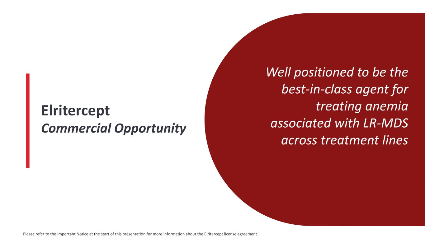 Elritercept Commercial Opportunity Well positioned to be the best-in-class agent for treating anemia associated with LR-MDS across treatment lines Please refer to the Important Notice at the start of this presentation for more information about the Elritercept license agreement
