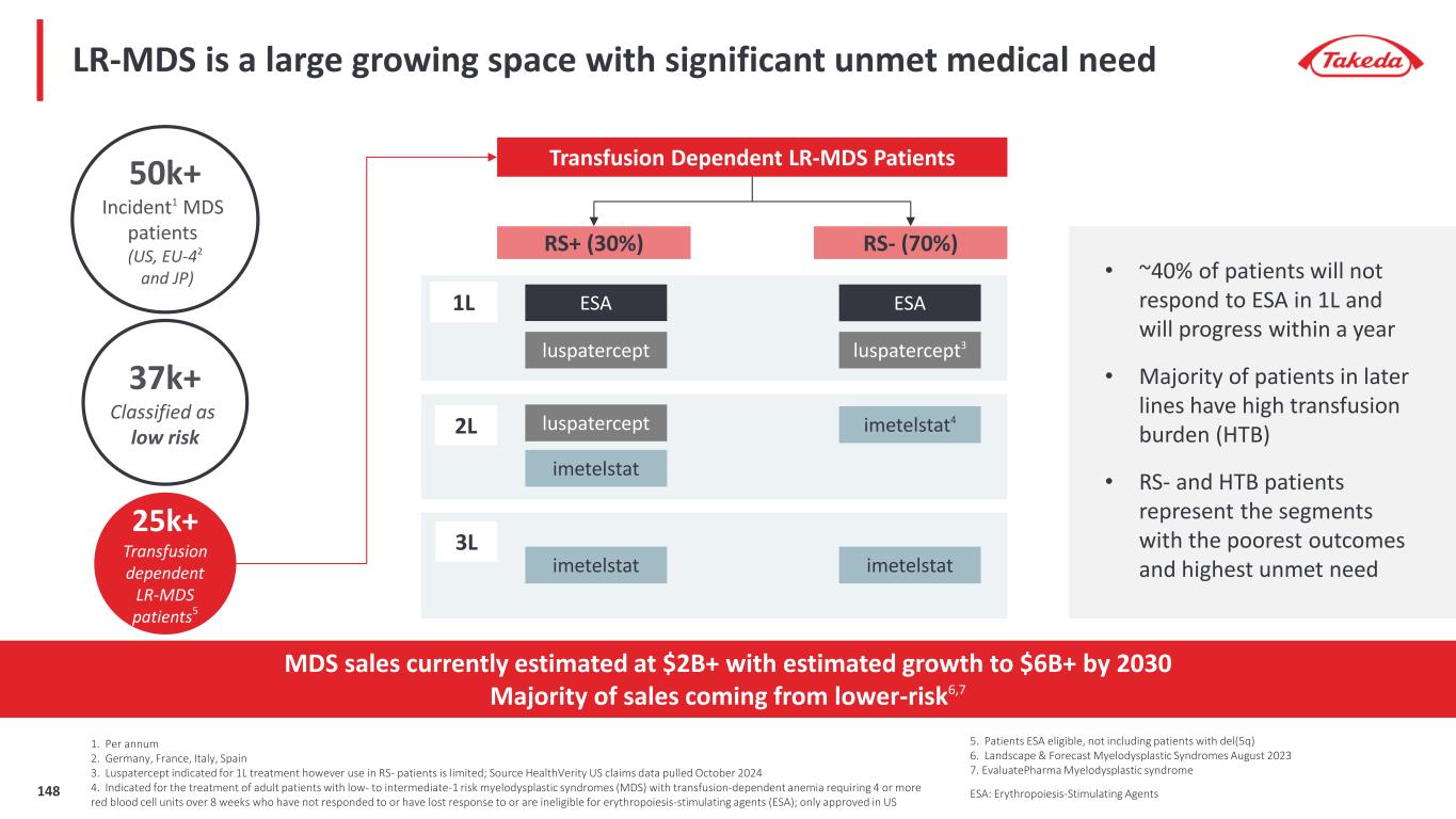 LR-MDS is a large growing space with significant unmet medical need MDS sales currently estimated at $2B+ with estimated growth to $6B+ by 2030 Majority of sales coming from lower-risk6,7 1. Per annum 2. Germany, France, Italy, Spain 3. Luspatercept indicated for 1L treatment however use in RS- patients is limited; Source HealthVerity US claims data pulled October 2024 4. Indicated for the treatment of adult patients with low- to intermediate-1 risk myelodysplastic syndromes (MDS) with transfusion-dependent anemia requiring 4 or more red blood cell units over 8 weeks who have not responded to or have lost response to or are ineligible for erythropoiesis-stimulating agents (ESA); only approved in US 50k+ Incident1 MDS patients (US, EU-42 and JP) 37k+ Classified as low risk 25k+ Transfusion dependent LR-MDS patients5 Transfusion Dependent LR-MDS Patients RS+ (30%) RS- (70%) 1L ESA luspatercept ESA luspatercept3 imetelstat 2L 3L luspatercept imetelstat4 imetelstat imetelstat • ~40% of patients will not respond to ESA in 1L and will progress within a year • Majority of patients in later lines have high transfusion burden (HTB) • RS- and HTB patients represent the segments with the poorest outcomes and highest unmet need 5. Patients ESA eligible, not including patients with del(5q) 6. Landscape & Forecast Myelodysplastic Syndromes August 2023 7. EvaluatePharma Myelodysplastic syndrome ESA: Erythropoiesis-Stimulating Agents148