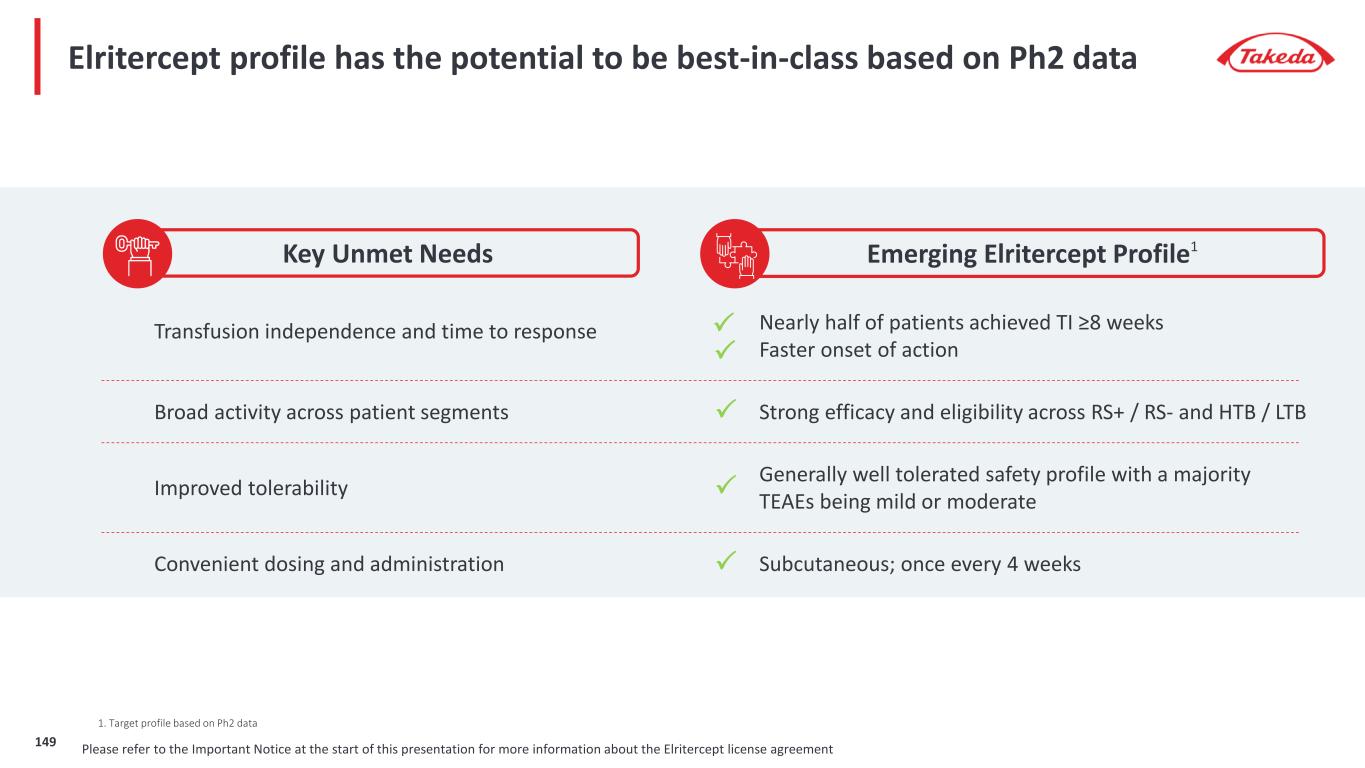 Elritercept profile has the potential to be best-in-class based on Ph2 data Key Unmet Needs Emerging Elritercept Profile1 Transfusion independence and time to response Nearly half of patients achieved TI ≥8 weeks Faster onset of action  Improved tolerability Generally well tolerated safety profile with a majority TEAEs being mild or moderate  Convenient dosing and administration Subcutaneous; once every 4 weeks Broad activity across patient segments Strong efficacy and eligibility across RS+ / RS- and HTB / LTB  1. Target profile based on Ph2 data Please refer to the Important Notice at the start of this presentation for more information about the Elritercept license agreement  149
