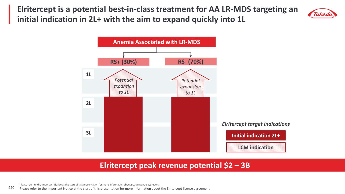 Elritercept is a potential best-in-class treatment for AA LR-MDS targeting an initial indication in 2L+ with the aim to expand quickly into 1L Anemia Associated with LR-MDS RS+ (30%) RS- (70%) Elritercept peak revenue potential $2 – 3B 1L 2L 3L Initial indication 2L+ LCM indication Elritercept target indications Potential expansion to 1L Potential expansion to 1L Please refer to the Important Notice at the start of this presentation for more information about peak revenue estimates. Please refer to the Important Notice at the start of this presentation for more information about the Elritercept license agreement150