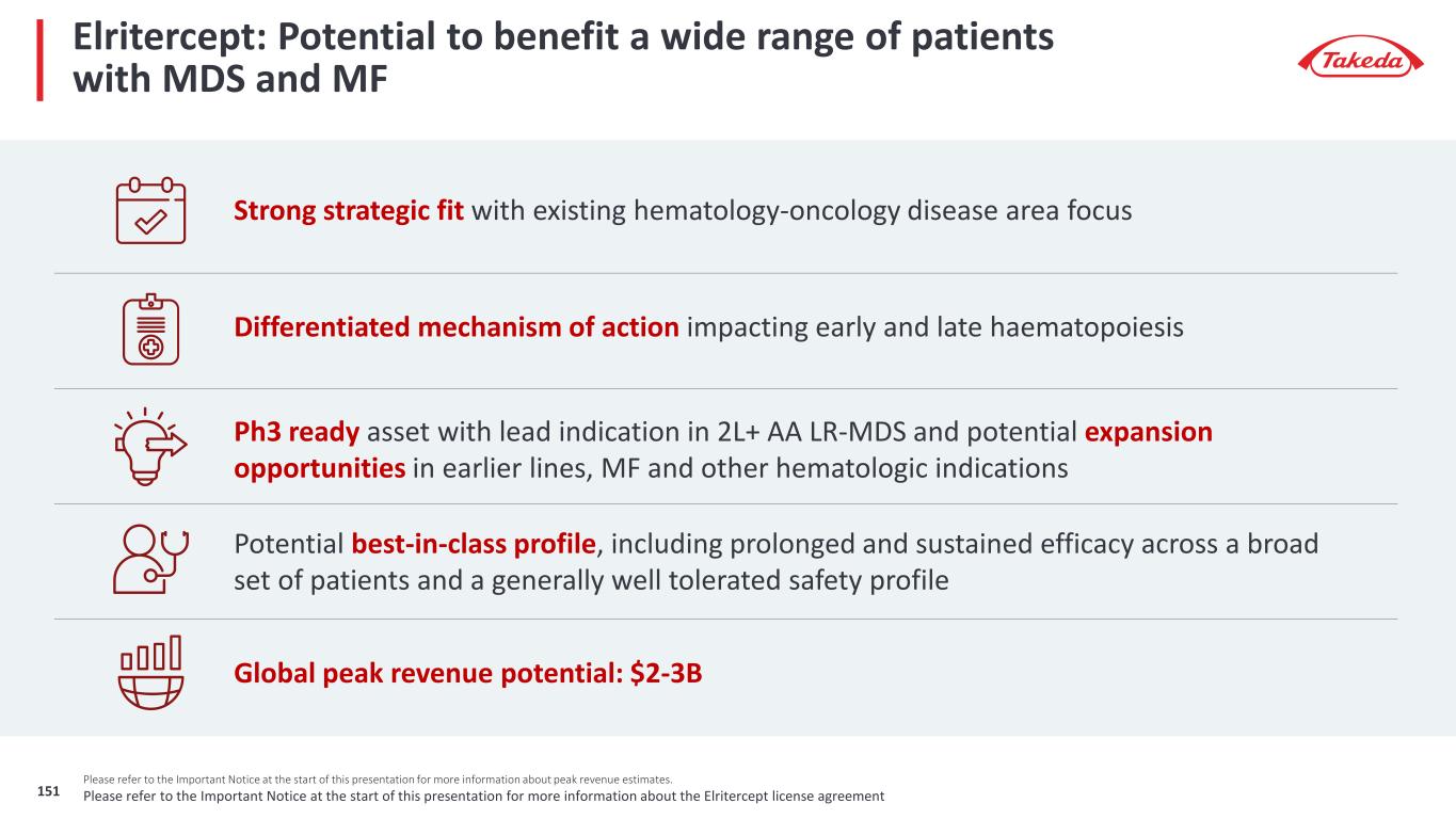 Global peak revenue potential: $2-3B Differentiated mechanism of action impacting early and late haematopoiesis Strong strategic fit with existing hematology-oncology disease area focus Ph3 ready asset with lead indication in 2L+ AA LR-MDS and potential expansion opportunities in earlier lines, MF and other hematologic indications Potential best-in-class profile, including prolonged and sustained efficacy across a broad set of patients and a generally well tolerated safety profile Please refer to the Important Notice at the start of this presentation for more information about peak revenue estimates. Please refer to the Important Notice at the start of this presentation for more information about the Elritercept license agreement Elritercept: Potential to benefit a wide range of patients with MDS and MF 151