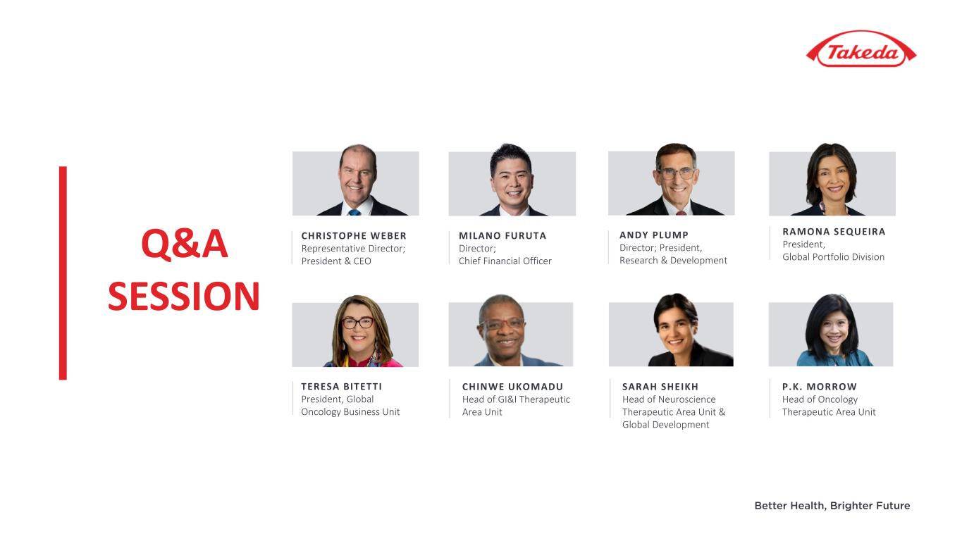 Q&A SESSION CHINWE UKOMADU Head of GI&I Therapeutic Area Unit SARAH SHEIKH Head of Neuroscience Therapeutic Area Unit & Global Development P.K. MORROW Head of Oncology Therapeutic Area Unit ANDY PLUMP Director; President, Research & Development CHRISTOPHE WEBER Representative Director; President & CEO MILANO FURUTA Director; Chief Financial Officer RAMONA SEQUEIRA President, Global Portfolio Division TERESA BITETTI President, Global Oncology Business Unit
