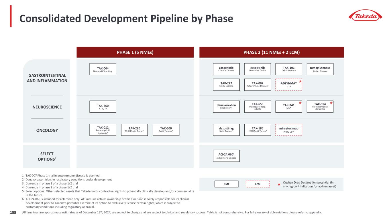 PHASE 2 (11 NMEs + 2 LCM)PHASE 1 (5 NMEs) ONCOLOGY Consolidated Development Pipeline by Phase NEUROSCIENCE dazostinag Solid Tumors4 TAK-012 Acute myeloid leukemia3 ACI-24.0606 Alzheimer’s Disease zamaglutenase Celiac Disease ADZYNMA® iTTP TAK-500 Solid Tumors3 1. TAK-007 Phase 1 trial in autoimmune disease is planned 2. Danavorexton trials in respiratory conditions under development 3. Currently in phase 1 of a phase 1/2 trial 4. Currently in phase 2 of a phase 1/2 trial 5. Select options: Other selected assets that Takeda holds contractual rights to potentially clinically develop and/or commercialize in the future. 6. ACI-24.060 is included for reference only. AC Immune retains ownership of this asset and is solely responsible for its clinical development prior to Takeda’s potential exercise of its option to exclusively license certain rights, which is subject to customary conditions including regulatory approval. TAK-280 B7-H3 Solid Tumor3 GASTROINTESTINAL AND INFLAMMATION TAK-101 Celiac Disease TAK-007 Autoimmune Disease1 zasocitinib Crohn’s Disease zasocitinib Ulcerative Colitis TAK-360 NT2 / IH mirvetuximab PROC (JP)4 TAK-186 EGFR Solid Tumor4 SELECT OPTIONS5 All timelines are approximate estimates as of December 13th, 2024, are subject to change and are subject to clinical and regulatory success. Table is not comprehensive. For full glossary of abbreviations please refer to appendix. danavorexton Respiratory2 TAK-594 Frontotemporal dementia TAK-341 MSA TAK-004 Nausea & Vomiting TAK-227 Celiac Disease TAK-653 Inadequate resp. in MDD Orphan Drug Designation potential (in any region / indication for a given asset) NME LCM 155