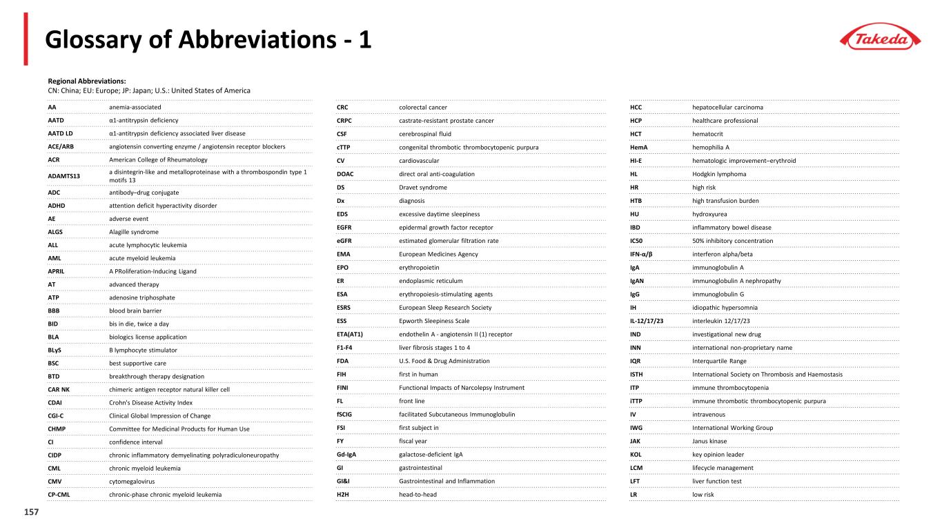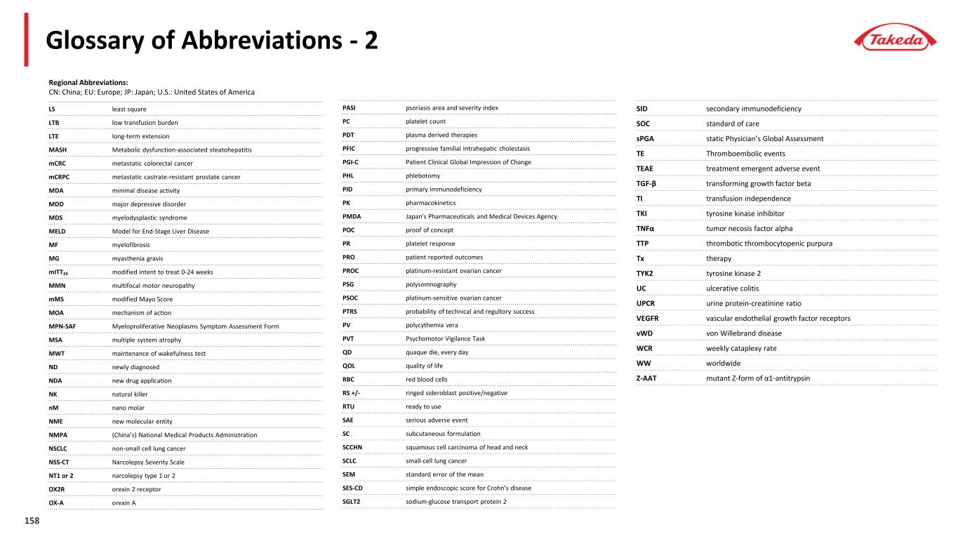 158 Regional Abbreviations: CN: China; EU: Europe; JP: Japan; U.S.: United States of America Glossary of Abbreviations - 2 LS least square LTB low transfusion burden LTE long-term extension MASH Metabolic dysfunction-associated steatohepatitis mCRC metastatic colorectal cancer mCRPC metastatic castrate-resistant prostate cancer MDA minimal disease activity MDD major depressive disorder MDS myelodysplastic syndrome MELD Model for End-Stage Liver Disease MF myelofibrosis MG myasthenia gravis mITT24 modified intent to treat 0-24 weeks MMN multifocal motor neuropathy mMS modified Mayo Score MOA mechanism of action MPN-SAF Myeloproliferative Neoplasms Symptom Assessment Form MSA multiple system atrophy MWT maintenance of wakefulness test ND newly diagnosed NDA new drug application NK natural killer nM nano molar NME new molecular entity NMPA (China’s) National Medical Products Administration NSCLC non-small cell lung cancer NSS-CT Narcolepsy Severity Scale NT1 or 2 narcolepsy type 1 or 2 OX2R orexin 2 receptor OX-A orexin A PASI psoriasis area and severity index PC platelet count PDT plasma derived therapies PFIC progressive familial intrahepatic cholestasis PGI-C Patient Clinical Global Impression of Change PHL phlebotomy PID primary immunodeficiency PK pharmacokinetics PMDA Japan’s Pharmaceuticals and Medical Devices Agency POC proof of concept PR platelet response PRO patient reported outcomes PROC platinum-resistant ovarian cancer PSG polysomnography PSOC platinum-sensitive ovarian cancer PTRS probability of technical and regultory success PV polycythemia vera PVT Psychomotor Vigilance Task QD quaque die, every day QOL quality of life RBC red blood cells RS +/- ringed sideroblast positive/negative RTU ready to use SAE serious adverse event SC subcutaneous formulation SCCHN squamous cell carcinoma of head and neck SCLC small-cell lung cancer SEM standard error of the mean SES-CD simple endoscopic score for Crohn’s disease SGLT2 sodium-glucose transport protein 2 SID secondary immunodeficiency SOC standard of care sPGA static Physician’s Global Assessment TE Thromboembolic events TEAE treatment emergent adverse event TGF-β transforming growth factor beta TI transfusion independence TKI tyrosine kinase inhibitor TNFα tumor necosis factor alpha TTP thrombotic thrombocytopenic purpura Tx therapy TYK2 tyrosine kinase 2 UC ulcerative colitis UPCR urine protein-creatinine ratio VEGFR vascular endothelial growth factor receptors vWD von Willebrand disease WCR weekly cataplexy rate WW worldwide Z-AAT mutant Z-form of α1-antitrypsin