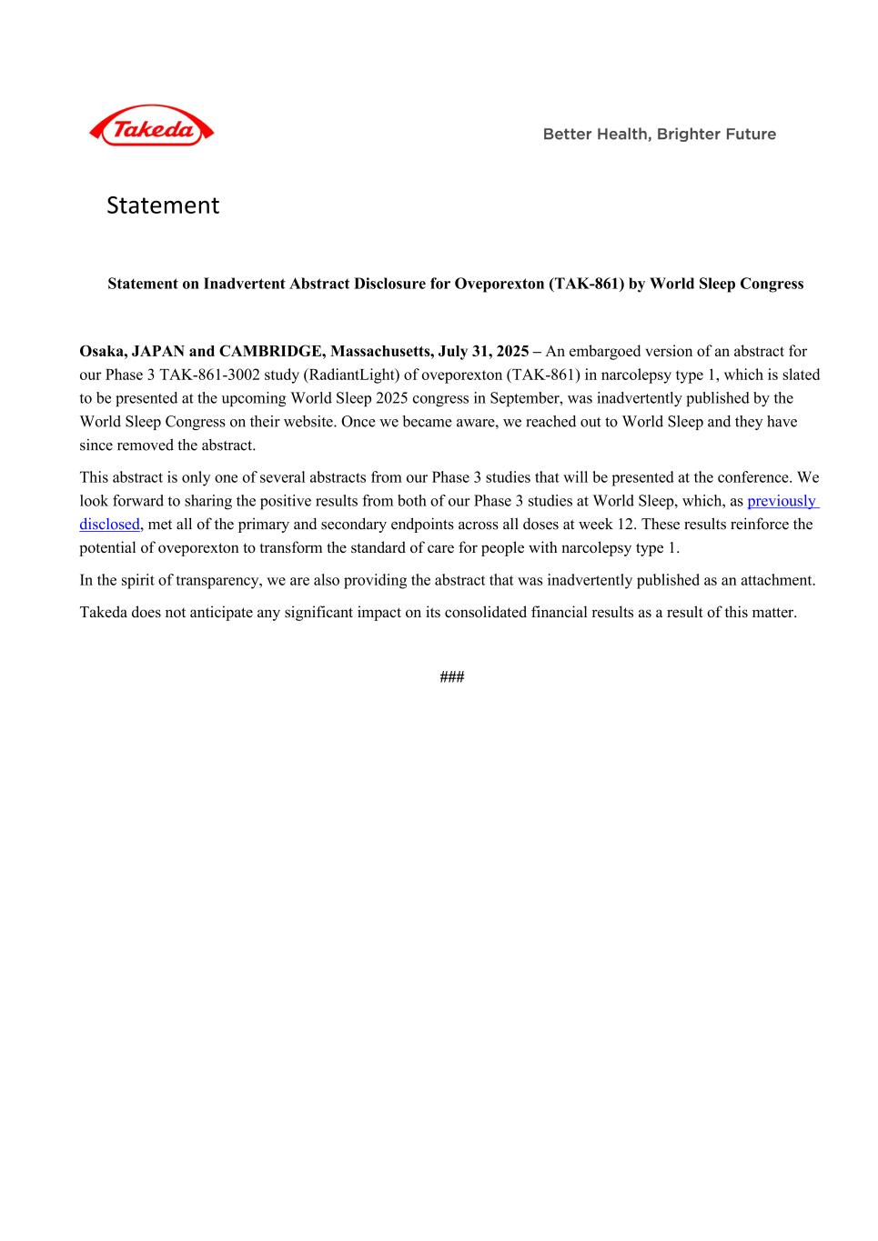 Statement Statement on Inadvertent Abstract Disclosure for Oveporexton (TAK-861) by World Sleep Congress Osaka, JAPAN and CAMBRIDGE, Massachusetts, July 31, 2025 – An embargoed version of an abstract for our Phase 3 TAK-861-3002 study (RadiantLight) of oveporexton (TAK-861) in narcolepsy type 1, which is slated to be presented at the upcoming World Sleep 2025 congress in September, was inadvertently published by the World Sleep Congress on their website. Once we became aware, we reached out to World Sleep and they have since removed the abstract. This abstract is only one of several abstracts from our Phase 3 studies that will be presented at the conference. We look forward to sharing the positive results from both of our Phase 3 studies at World Sleep, which, as previously disclosed, met all of the primary and secondary endpoints across all doses at week 12. These results reinforce the potential of oveporexton to transform the standard of care for people with narcolepsy type 1. In the spirit of transparency, we are also providing the abstract that was inadvertently published as an attachment. Takeda does not anticipate any significant impact on its consolidated financial results as a result of this matter. ###