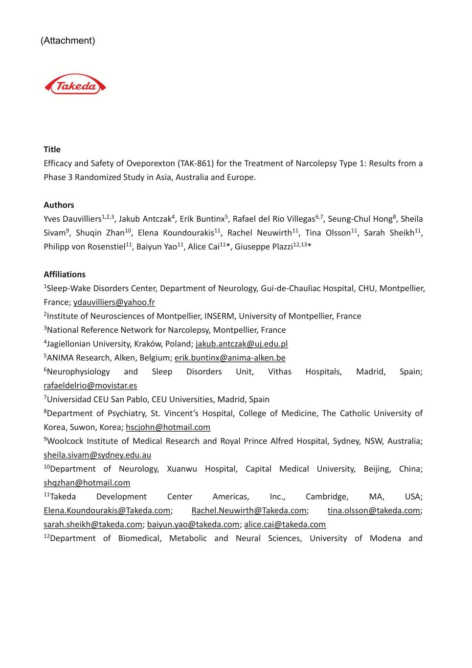 Title Efficacy and Safety of Oveporexton (TAK-861) for the Treatment of Narcolepsy Type 1: Results from a Phase 3 Randomized Study in Asia, Australia and Europe. Authors Yves Dauvilliers1,2,3, Jakub Antczak4, Erik Buntinx5, Rafael del Rio Villegas6,7, Seung-Chul Hong8, Sheila Sivam9, Shuqin Zhan10, Elena Koundourakis11, Rachel Neuwirth11, Tina Olsson11, Sarah Sheikh11, Philipp von Rosenstiel11, Baiyun Yao11, Alice Cai11*, Giuseppe Plazzi12,13* Affiliations 1Sleep-Wake Disorders Center, Department of Neurology, Gui-de-Chauliac Hospital, CHU, Montpellier, France; ydauvilliers@yahoo.fr 2Institute of Neurosciences of Montpellier, INSERM, University of Montpellier, France 3National Reference Network for Narcolepsy, Montpellier, France 4Jagiellonian University, Kraków, Poland; jakub.antczak@uj.edu.pl 5ANIMA Research, Alken, Belgium; erik.buntinx@anima-alken.be 6Neurophysiology and Sleep Disorders Unit, Vithas Hospitals, Madrid, Spain; rafaeldelrio@movistar.es 7Universidad CEU San Pablo, CEU Universities, Madrid, Spain 8Department of Psychiatry, St. Vincent’s Hospital, College of Medicine, The Catholic University of Korea, Suwon, Korea; hscjohn@hotmail.com 9Woolcock Institute of Medical Research and Royal Prince Alfred Hospital, Sydney, NSW, Australia; sheila.sivam@sydney.edu.au 10Department of Neurology, Xuanwu Hospital, Capital Medical University, Beijing, China; shqzhan@hotmail.com 11Takeda Development Center Americas, Inc., Cambridge, MA, USA; Elena.Koundourakis@Takeda.com; Rachel.Neuwirth@Takeda.com; tina.olsson@takeda.com; sarah.sheikh@takeda.com; baiyun.yao@takeda.com; alice.cai@takeda.com 12Department of Biomedical, Metabolic and Neural Sciences, University of Modena and (Attachment)