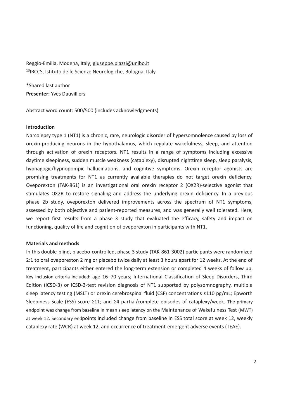 2 Reggio-Emilia, Modena, Italy; giuseppe.plazzi@unibo.it 13IRCCS, Istituto delle Scienze Neurologiche, Bologna, Italy *Shared last author Presenter: Yves Dauvilliers Abstract word count: 500/500 (includes acknowledgments) Introduction Narcolepsy type 1 (NT1) is a chronic, rare, neurologic disorder of hypersomnolence caused by loss of orexin-producing neurons in the hypothalamus, which regulate wakefulness, sleep, and attention through activation of orexin receptors. NT1 results in a range of symptoms including excessive daytime sleepiness, sudden muscle weakness (cataplexy), disrupted nighttime sleep, sleep paralysis, hypnagogic/hypnopompic hallucinations, and cognitive symptoms. Orexin receptor agonists are promising treatments for NT1 as currently available therapies do not target orexin deficiency. Oveporexton (TAK-861) is an investigational oral orexin receptor 2 (OX2R)-selective agonist that stimulates OX2R to restore signaling and address the underlying orexin deficiency. In a previous phase 2b study, oveporexton delivered improvements across the spectrum of NT1 symptoms, assessed by both objective and patient-reported measures, and was generally well tolerated. Here, we report first results from a phase 3 study that evaluated the efficacy, safety and impact on functioning, quality of life and cognition of oveporexton in participants with NT1. Materials and methods In this double-blind, placebo-controlled, phase 3 study (TAK-861-3002) participants were randomized 2:1 to oral oveporexton 2 mg or placebo twice daily at least 3 hours apart for 12 weeks. At the end of treatment, participants either entered the long-term extension or completed 4 weeks of follow up. Key inclusion criteria included: age 16–70 years; International Classification of Sleep Disorders, Third Edition (ICSD-3) or ICSD-3-text revision diagnosis of NT1 supported by polysomnography, multiple sleep latency testing (MSLT) or orexin cerebrospinal fluid (CSF) concentrations ≤110 pg/mL; Epworth Sleepiness Scale (ESS) score ≥11; and ≥4 partial/complete episodes of cataplexy/week. The primary endpoint was change from baseline in mean sleep latency on the Maintenance of Wakefulness Test (MWT) at week 12. Secondary endpoints included change from baseline in ESS total score at week 12, weekly cataplexy rate (WCR) at week 12, and occurrence of treatment-emergent adverse events (TEAE).