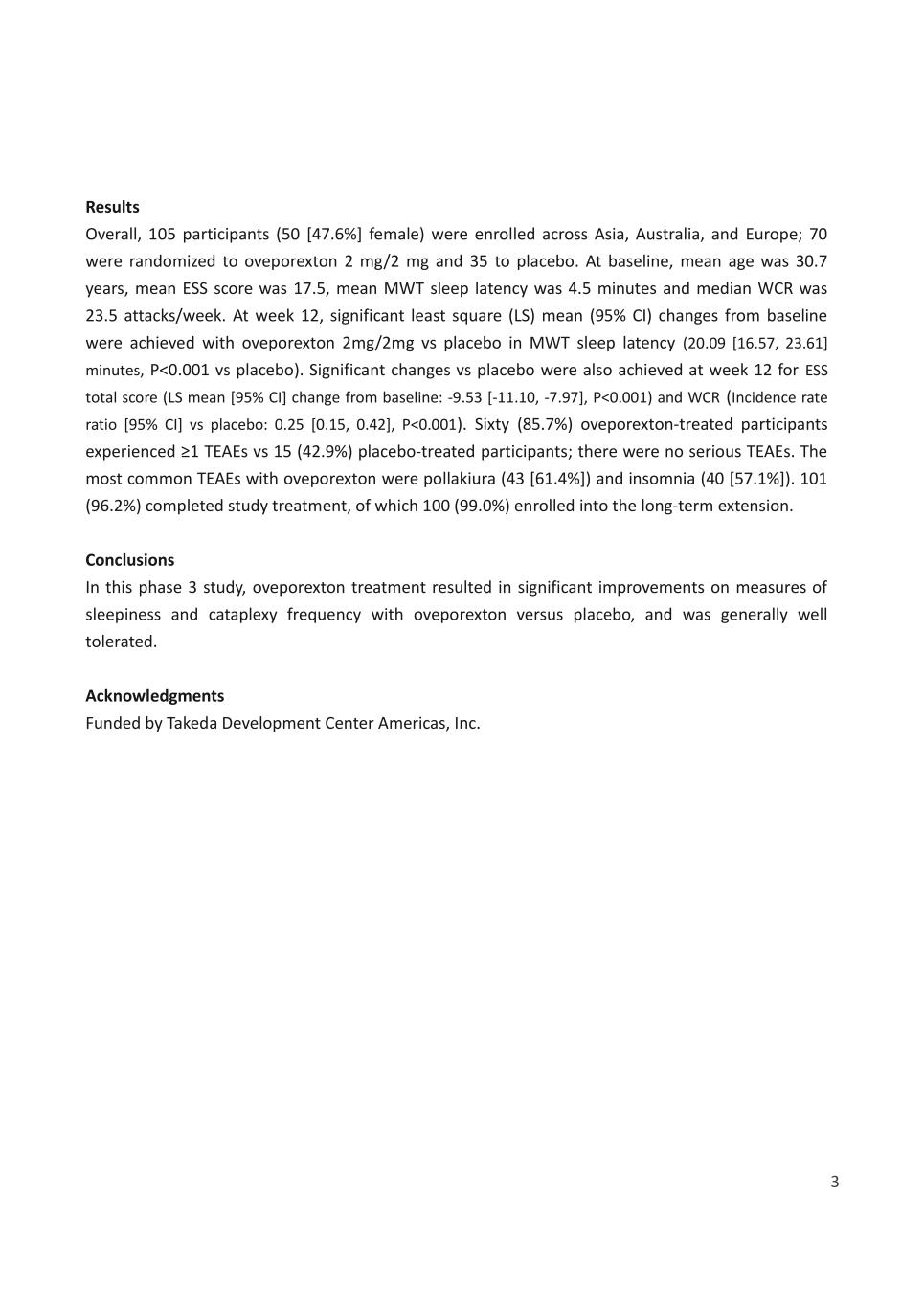 3 Results Overall, 105 participants (50 [47.6%] female) were enrolled across Asia, Australia, and Europe; 70 were randomized to oveporexton 2 mg/2 mg and 35 to placebo. At baseline, mean age was 30.7 years, mean ESS score was 17.5, mean MWT sleep latency was 4.5 minutes and median WCR was 23.5 attacks/week. At week 12, significant least square (LS) mean (95% CI) changes from baseline were achieved with oveporexton 2mg/2mg vs placebo in MWT sleep latency (20.09 [16.57, 23.61] minutes, P<0.001 vs placebo). Significant changes vs placebo were also achieved at week 12 for ESS total score (LS mean [95% CI] change from baseline: -9.53 [-11.10, -7.97], P<0.001) and WCR (Incidence rate ratio [95% CI] vs placebo: 0.25 [0.15, 0.42], P<0.001). Sixty (85.7%) oveporexton-treated participants experienced ≥1 TEAEs vs 15 (42.9%) placebo-treated participants; there were no serious TEAEs. The most common TEAEs with oveporexton were pollakiura (43 [61.4%]) and insomnia (40 [57.1%]). 101 (96.2%) completed study treatment, of which 100 (99.0%) enrolled into the long-term extension. Conclusions In this phase 3 study, oveporexton treatment resulted in significant improvements on measures of sleepiness and cataplexy frequency with oveporexton versus placebo, and was generally well tolerated. Acknowledgments Funded by Takeda Development Center Americas, Inc.