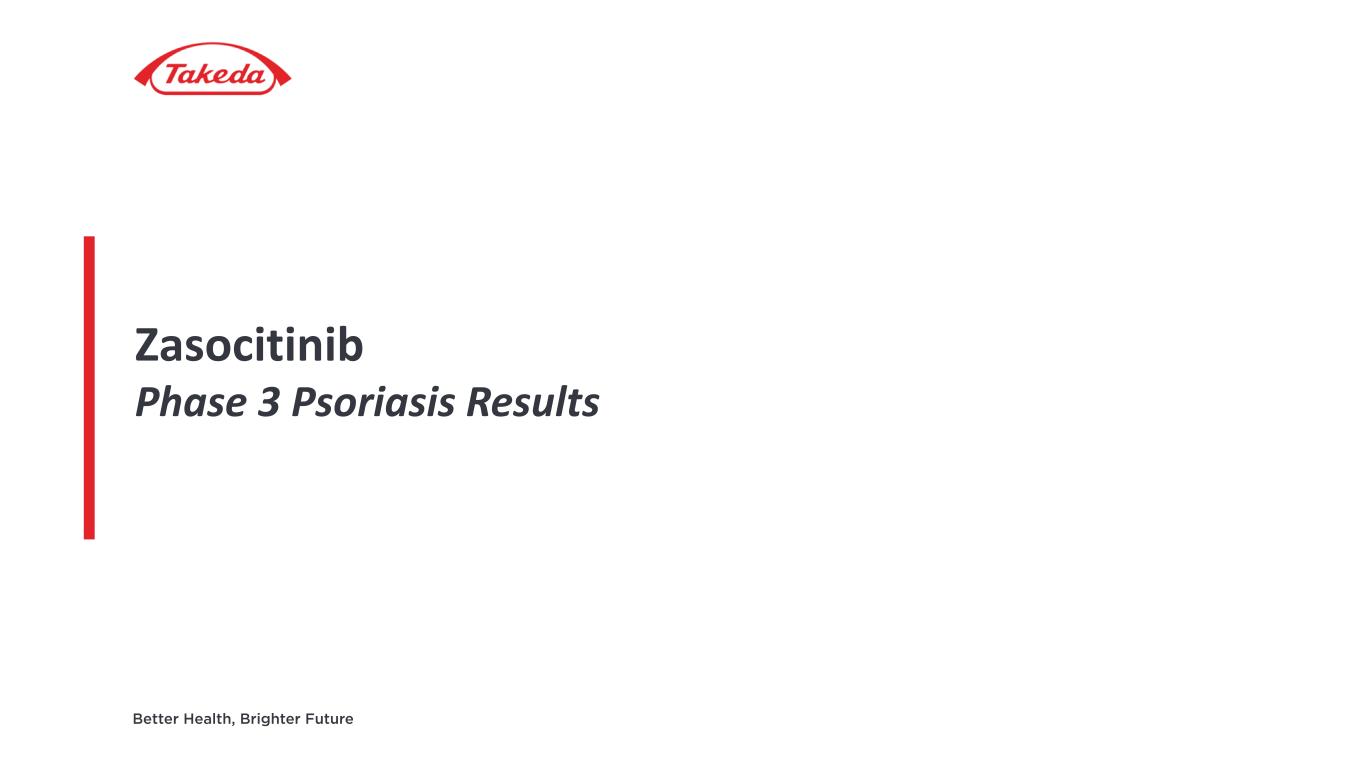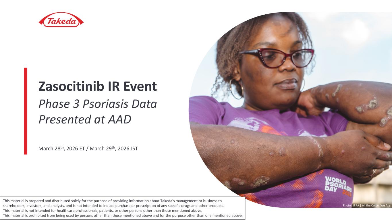 Zasocitinib IR Event Phase 3 Psoriasis Data Presented at AAD March 28th, 2026 ET / March 29th, 2026 JST This material is prepared and distributed solely for the purpose of providing information about Takeda's management or business to shareholders, investors, and analysts, and is not intended to induce purchase or prescription of any specific drugs and other products. This material is not intended for healthcare professionals, patients, or other persons other than those mentioned above. This material is prohibited from being used by persons other than those mentioned above and for the purpose other than one mentioned above. Photo: IFPA | All the Colors We Are