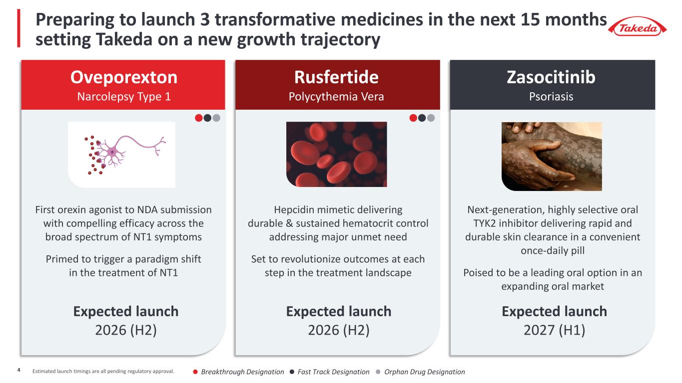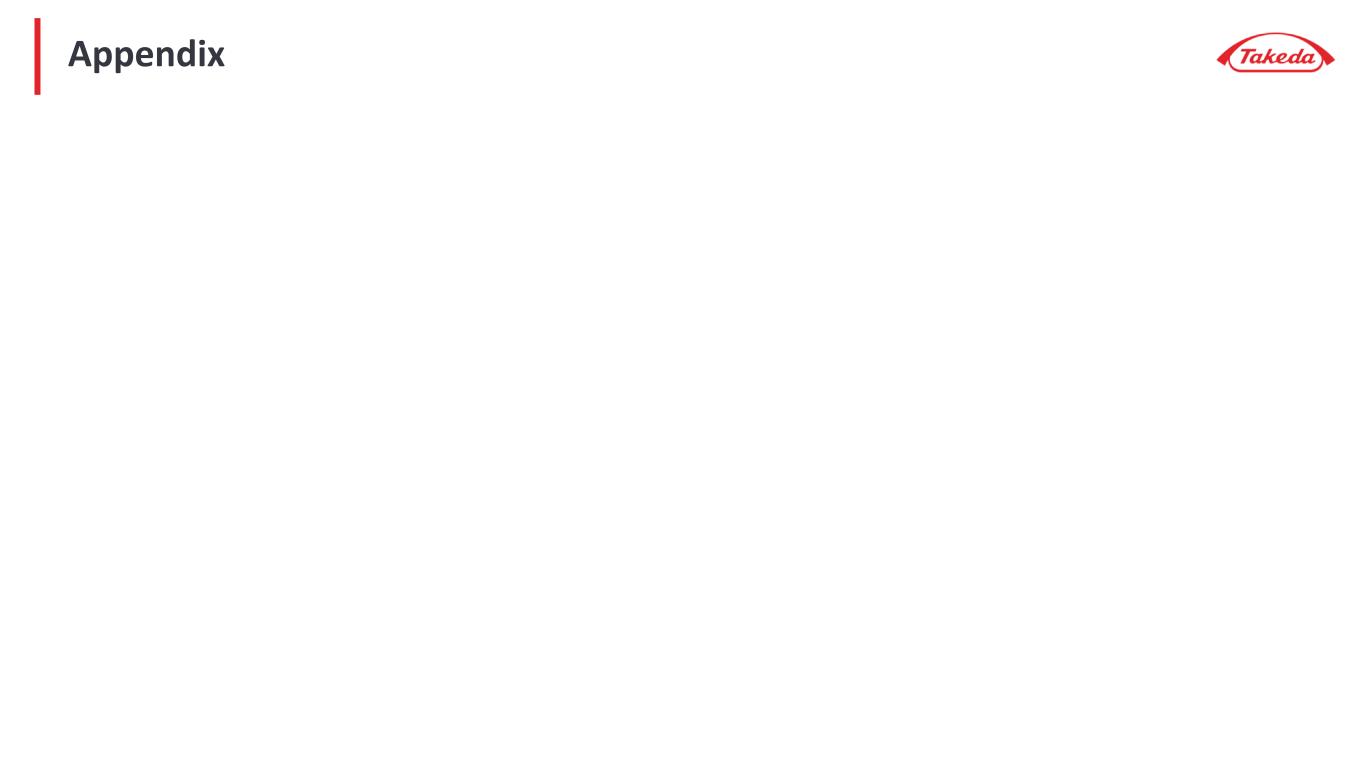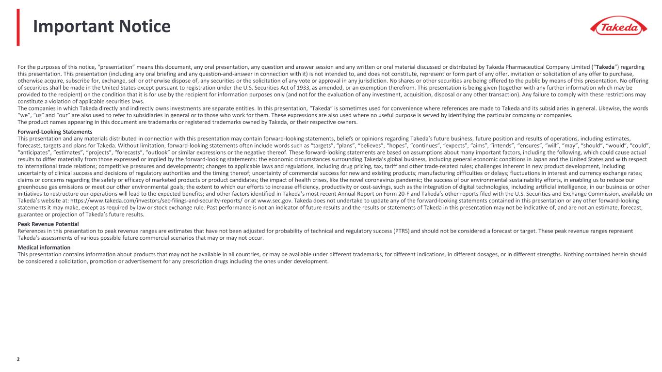 For the purposes of this notice, “presentation” means this document, any oral presentation, any question and answer session and any written or oral material discussed or distributed by Takeda Pharmaceutical Company Limited (“Takeda”) regarding this presentation. This presentation (including any oral briefing and any question-and-answer in connection with it) is not intended to, and does not constitute, represent or form part of any offer, invitation or solicitation of any offer to purchase, otherwise acquire, subscribe for, exchange, sell or otherwise dispose of, any securities or the solicitation of any vote or approval in any jurisdiction. No shares or other securities are being offered to the public by means of this presentation. No offering of securities shall be made in the United States except pursuant to registration under the U.S. Securities Act of 1933, as amended, or an exemption therefrom. This presentation is being given (together with any further information which may be provided to the recipient) on the condition that it is for use by the recipient for information purposes only (and not for the evaluation of any investment, acquisition, disposal or any other transaction). Any failure to comply with these restrictions may constitute a violation of applicable securities laws. The companies in which Takeda directly and indirectly owns investments are separate entities. In this presentation, “Takeda” is sometimes used for convenience where references are made to Takeda and its subsidiaries in general. Likewise, the words “we”, “us” and “our” are also used to refer to subsidiaries in general or to those who work for them. These expressions are also used where no useful purpose is served by identifying the particular company or companies. The product names appearing in this document are trademarks or registered trademarks owned by Takeda, or their respective owners. Forward-Looking Statements This presentation and any materials distributed in connection with this presentation may contain forward-looking statements, beliefs or opinions regarding Takeda’s future business, future position and results of operations, including estimates, forecasts, targets and plans for Takeda. Without limitation, forward-looking statements often include words such as “targets”, “plans”, “believes”, “hopes”, “continues”, “expects”, “aims”, “intends”, “ensures”, “will”, “may”, “should”, “would”, “could”, “anticipates”, “estimates”, “projects”, “forecasts”, “outlook” or similar expressions or the negative thereof. These forward-looking statements are based on assumptions about many important factors, including the following, which could cause actual results to differ materially from those expressed or implied by the forward-looking statements: the economic circumstances surrounding Takeda’s global business, including general economic conditions in Japan and the United States and with respect to international trade relations; competitive pressures and developments; changes to applicable laws and regulations, including drug pricing, tax, tariff and other trade-related rules; challenges inherent in new product development, including uncertainty of clinical success and decisions of regulatory authorities and the timing thereof; uncertainty of commercial success for new and existing products; manufacturing difficulties or delays; fluctuations in interest and currency exchange rates; claims or concerns regarding the safety or efficacy of marketed products or product candidates; the impact of health crises, like the novel coronavirus pandemic; the success of our environmental sustainability efforts, in enabling us to reduce our greenhouse gas emissions or meet our other environmental goals; the extent to which our efforts to increase efficiency, productivity or cost-savings, such as the integration of digital technologies, including artificial intelligence, in our business or other initiatives to restructure our operations will lead to the expected benefits; and other factors identified in Takeda’s most recent Annual Report on Form 20-F and Takeda’s other reports filed with the U.S. Securities and Exchange Commission, available on Takeda’s website at: https://www.takeda.com/investors/sec-filings-and-security-reports/ or at www.sec.gov. Takeda does not undertake to update any of the forward-looking statements contained in this presentation or any other forward-looking statements it may make, except as required by law or stock exchange rule. Past performance is not an indicator of future results and the results or statements of Takeda in this presentation may not be indicative of, and are not an estimate, forecast, guarantee or projection of Takeda’s future results. Peak Revenue Potential References in this presentation to peak revenue ranges are estimates that have not been adjusted for probability of technical and regulatory success (PTRS) and should not be considered a forecast or target. These peak revenue ranges represent Takeda’s assessments of various possible future commercial scenarios that may or may not occur. Medical information This presentation contains information about products that may not be available in all countries, or may be available under different trademarks, for different indications, in different dosages, or in different strengths. Nothing contained herein should be considered a solicitation, promotion or advertisement for any prescription drugs including the ones under development. Important Notice 2