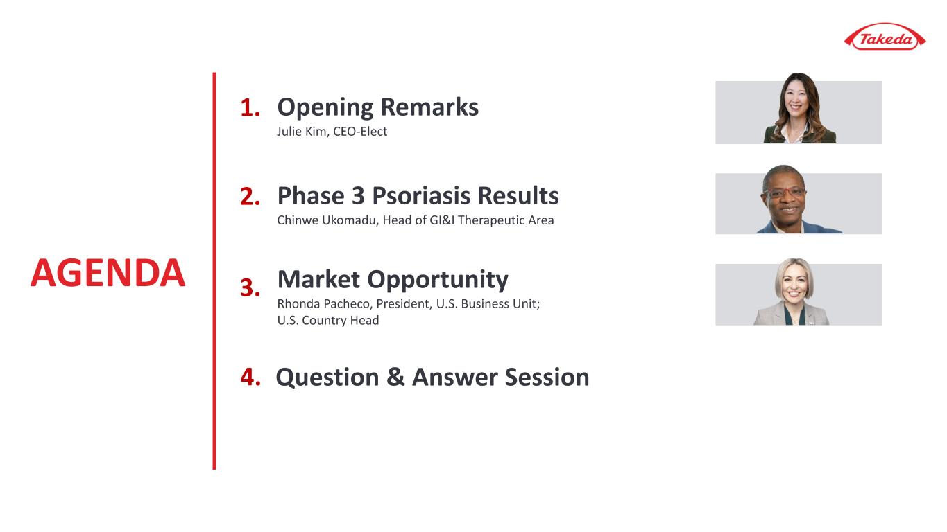 Opening Remarks Julie Kim, CEO-Elect Phase 3 Psoriasis Results Chinwe Ukomadu, Head of GI&I Therapeutic Area Market Opportunity Rhonda Pacheco, President, U.S. Business Unit; U.S. Country Head Question & Answer Session AGENDA 1. 2. 3. 4.