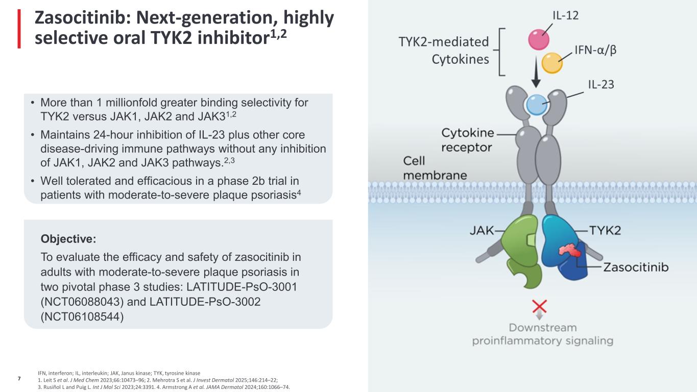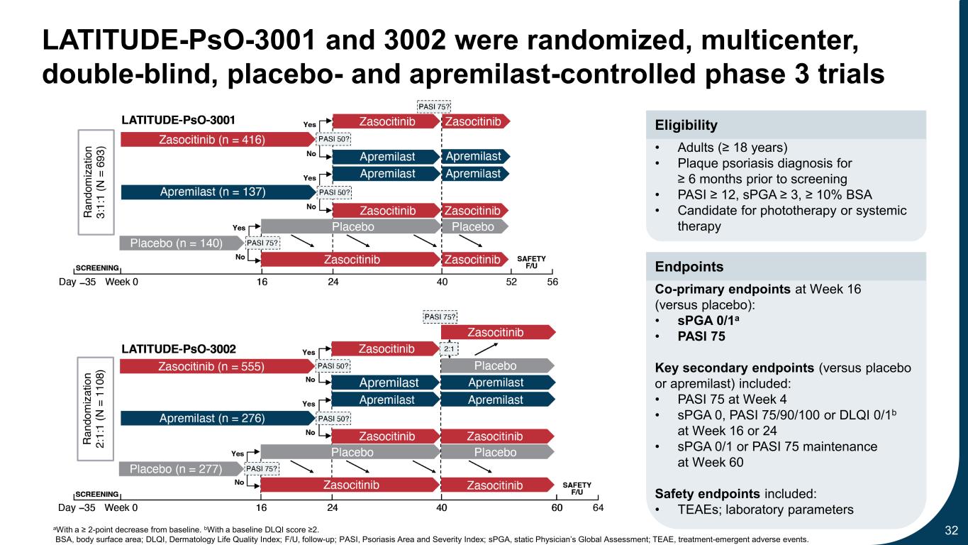 31 Zasocitinib is an investigational, oral, allosteric, highly selective and potent TYK2 inhibitor1,2 ATP, adenosine triphosphate; IFN, interferon; IL, interleukin; JAK, Janus kinase; TYK, tyrosine kinase. 1. Leit S et al. J Med Chem 2023;66:10473–96; 2. Mehrotra S et al. J Invest Dermatol 2025;146:214–22; 3. Rusiñol L and Puig L. Int J Mol Sci 2023;24:3391. 4. Armstrong A et al. JAMA Dermatol 2024;160:1066–74. • More than 1 millionfold greater binding selectivity for TYK2 versus JAK1, JAK2 and JAK31,2 • Maintains 24-hour inhibition of IL-23 plus other core disease-driving immune pathways2,3 • Well tolerated and efficacious in a phase 2b trial in patients with moderate-to-severe plaque psoriasis4 Objective: To evaluate the efficacy and safety of zasocitinib in adults with moderate-to-severe plaque psoriasis in two pivotal phase 3 studies: LATITUDE-PsO-3001 (NCT06088043) and LATITUDE-PsO-3002 (NCT06108544)
