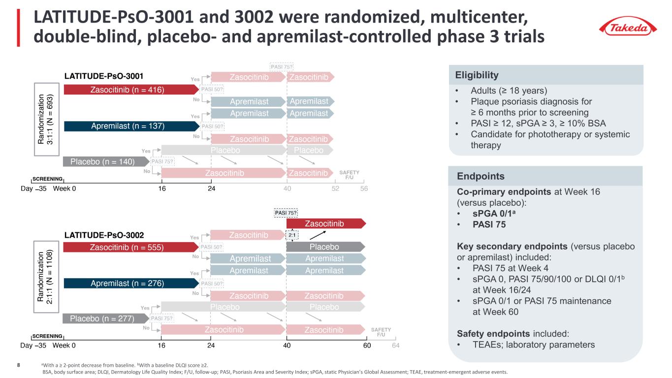 Zasocitinib: Next-generation, highly selective oral TYK2 inhibitor1,2 7 • More than 1 millionfold greater binding selectivity for TYK2 versus JAK1, JAK2 and JAK31,2 • Maintains 24-hour inhibition of IL-23 plus other core disease-driving immune pathways without any inhibition of JAK1, JAK2 and JAK3 pathways.2,3 • Well tolerated and efficacious in a phase 2b trial in patients with moderate-to-severe plaque psoriasis4 Objective: To evaluate the efficacy and safety of zasocitinib in adults with moderate-to-severe plaque psoriasis in two pivotal phase 3 studies: LATITUDE-PsO-3001 (NCT06088043) and LATITUDE-PsO-3002 (NCT06108544) IFN, interferon; IL, interleukin; JAK, Janus kinase; TYK, tyrosine kinase 1. Leit S et al. J Med Chem 2023;66:10473–96; 2. Mehrotra S et al. J Invest Dermatol 2025;146:214–22; 3. Rusiñol L and Puig L. Int J Mol Sci 2023;24:3391. 4. Armstrong A et al. JAMA Dermatol 2024;160:1066–74.