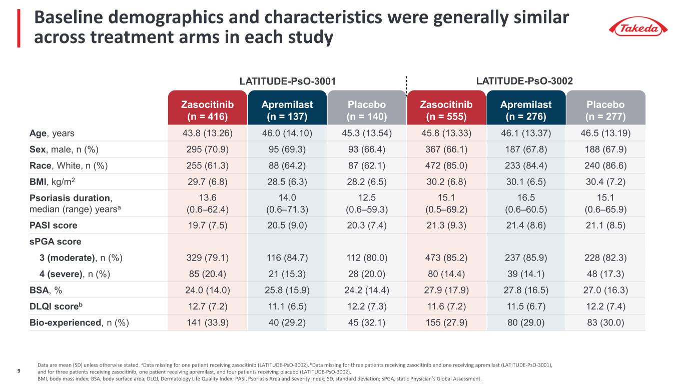 LATITUDE-PsO-3001 and 3002 were randomized, multicenter, double-blind, placebo- and apremilast-controlled phase 3 trials 8 Endpoints Co-primary endpoints at Week 16 (versus placebo): • sPGA 0/1a • PASI 75 Key secondary endpoints (versus placebo or apremilast) included: • PASI 75 at Week 4 • sPGA 0, PASI 75/90/100 or DLQI 0/1b at Week 16/24 • sPGA 0/1 or PASI 75 maintenance at Week 60 Safety endpoints included: • TEAEs; laboratory parameters Eligibility • Adults (≥ 18 years) • Plaque psoriasis diagnosis for ≥ 6 months prior to screening • PASI ≥ 12, sPGA ≥ 3, ≥ 10% BSA • Candidate for phototherapy or systemic therapy aWith a ≥ 2-point decrease from baseline. bWith a baseline DLQI score ≥2. BSA, body surface area; DLQI, Dermatology Life Quality Index; F/U, follow-up; PASI, Psoriasis Area and Severity Index; sPGA, static Physician’s Global Assessment; TEAE, treatment-emergent adverse events.